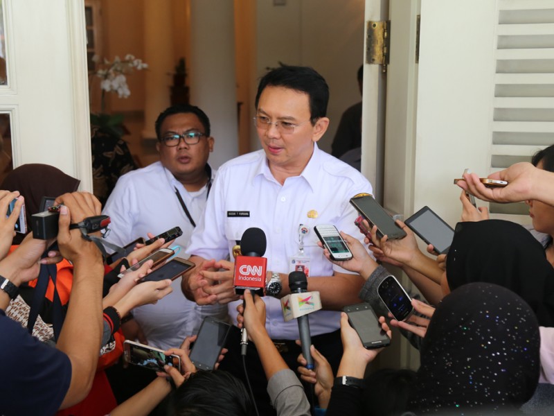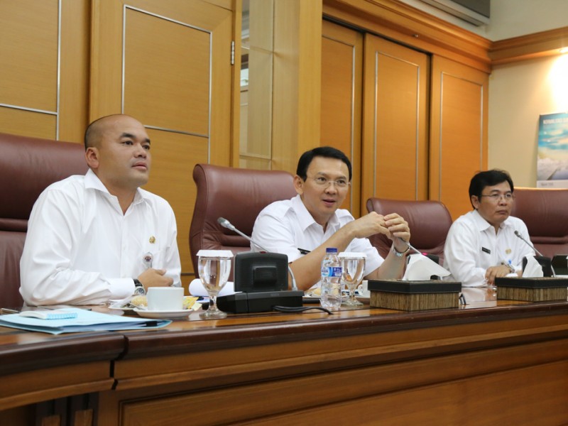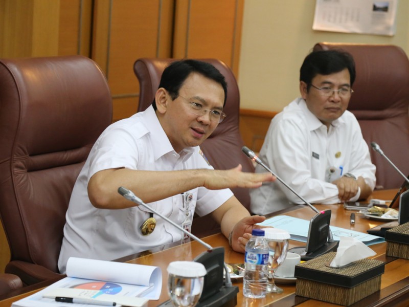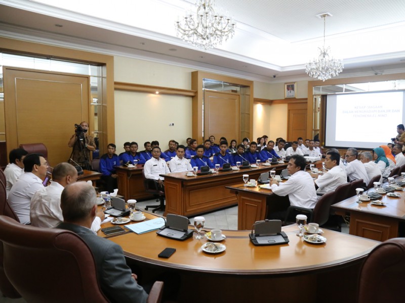 Gubernur DKI Jakarta Basuki Tjahaja Purnama memberikan arahan kepada Dinas Tata Air, penanggung jawab kali aliran tengah, penjaga pompa dan penjaga waduk untuk pengendalian banjir di Balai Kota DKI Jakarta, Rabu (02/03). (Foto: Reza/Beritajakarta.com)