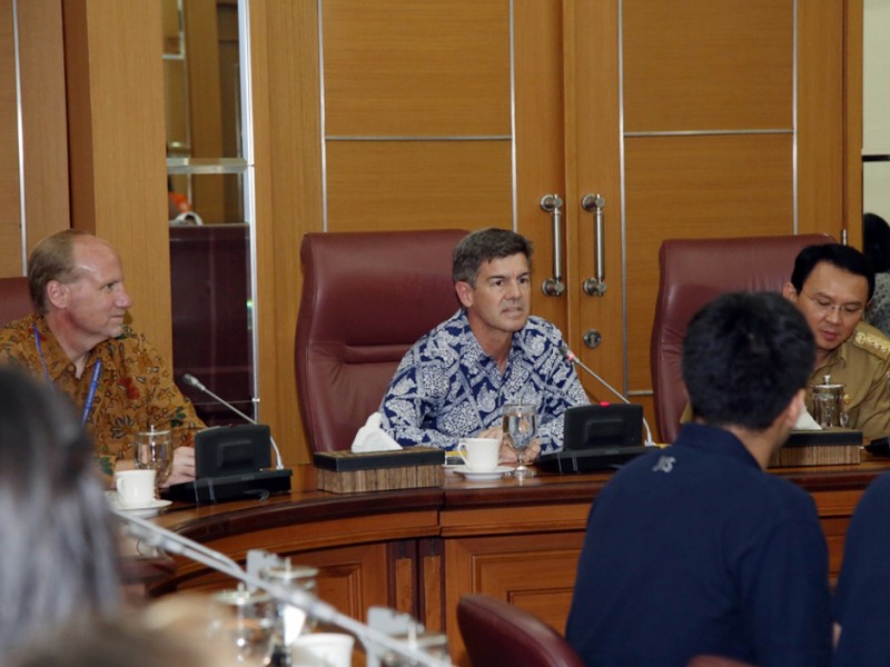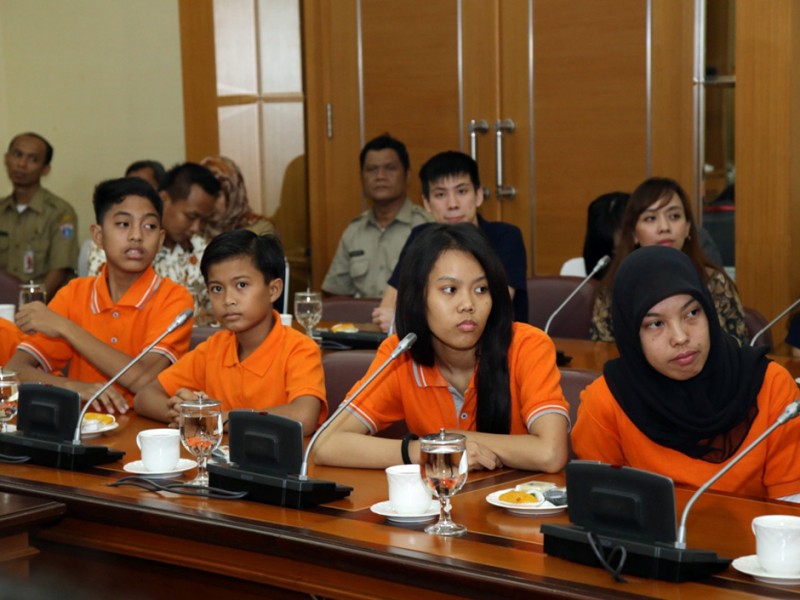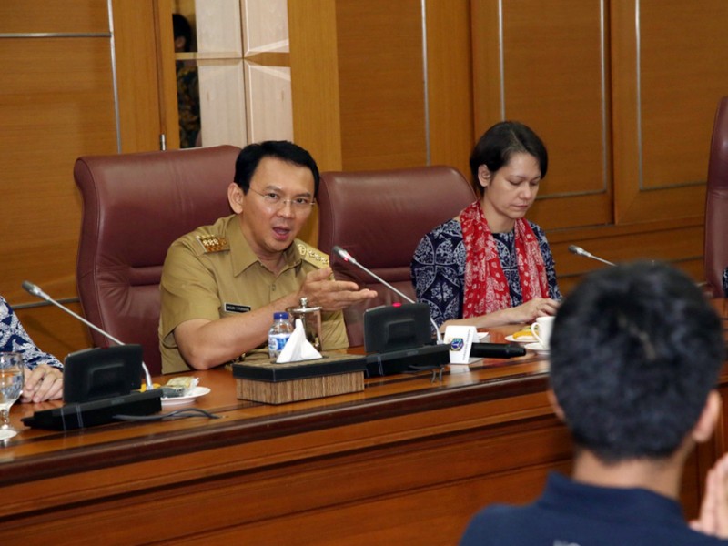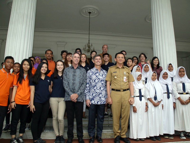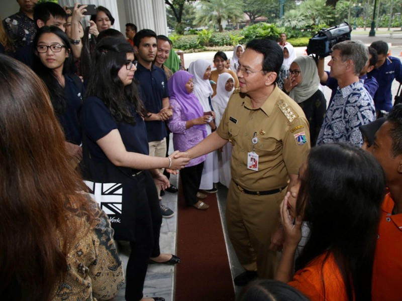 Gubernur DKI Jakarta, Basuki T Purnama menerima kunjungan siswa Jakarta Intercultural School (JIS) di Balaikota DKI Jakarta,Senin (21/3). Turut hadir dalam kunjungan ini anak-anak dari Yayasan Gerakan Kepedulian Indonesia Rusunawa Daan Mogot (GK RDM) yang memang bekerjasama dengan JIS dalam pembinaan Anak-anak yang kurang mampu.(Foto: Yopie/Beritajakarta.com)