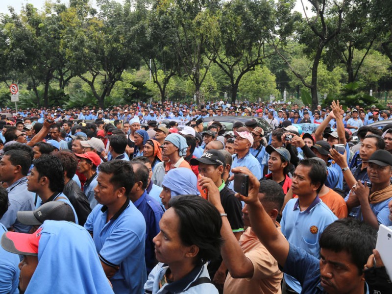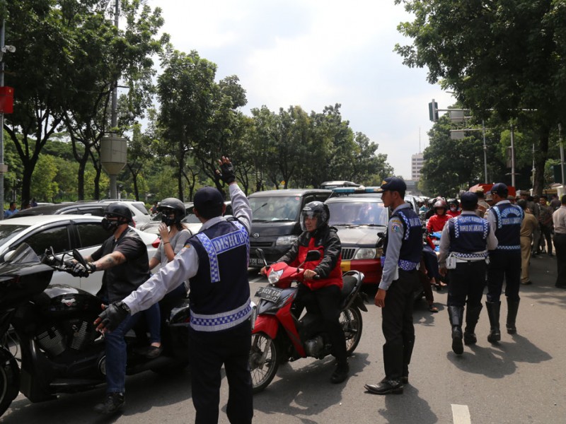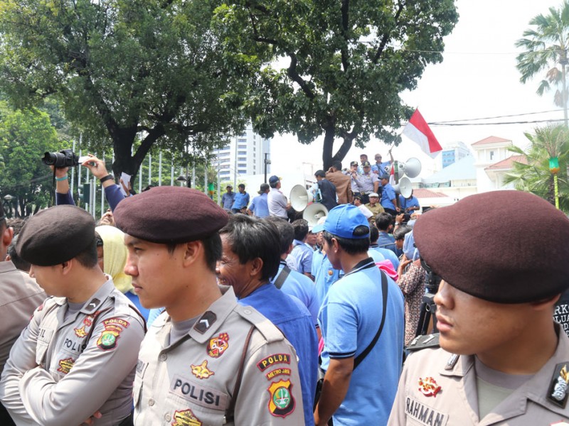Ratusan sopir Koperasi Wahana Kalpika (KWK) melakukan demontrasi di depan kantor Balai Kota DKI Jakarta, Jalan Medan Merdeka Selatan, Jakarta Pusat, Selasa (22/03). Masa aksi menutup jalan, sehingga kendaraan susah melintas.(Foto: Reza/beritajakarta.com)