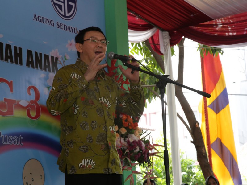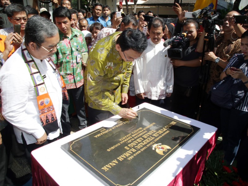 Gubernur DKI Jakarta, Basuki Tjahaja Purnama, meresmikan Ruang Publik Terpadu Ramah Anak (RPTRA) Tanah Abang 3 di Jalan Taman Tanah Abang 3, Kelurahan Petojo Selatan, Kecamatan Gambir, Jakarta Pusat, Kamis (24/3/2016). RPTRA Tanah Abang 3 di bangun di atas lahan seluas 1.052 meter persegi dan dibangun melalui program corporate social responsibility (CSR). Sejumlah sarana olahraga seperti lapangan futsal, lapangan basket, lapangan voli, dan joging track, serta ruang pertemuan, taman bermain, laktasi, perpustakaan dan kolam ikan hias terdapat di RPTRA ini.(Foto: Yopie/Beritajakarta.com)