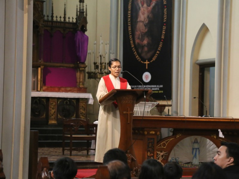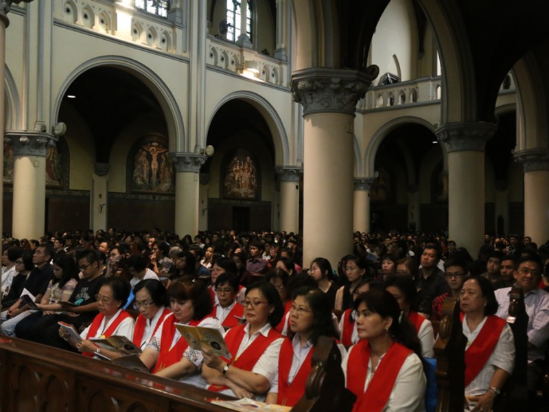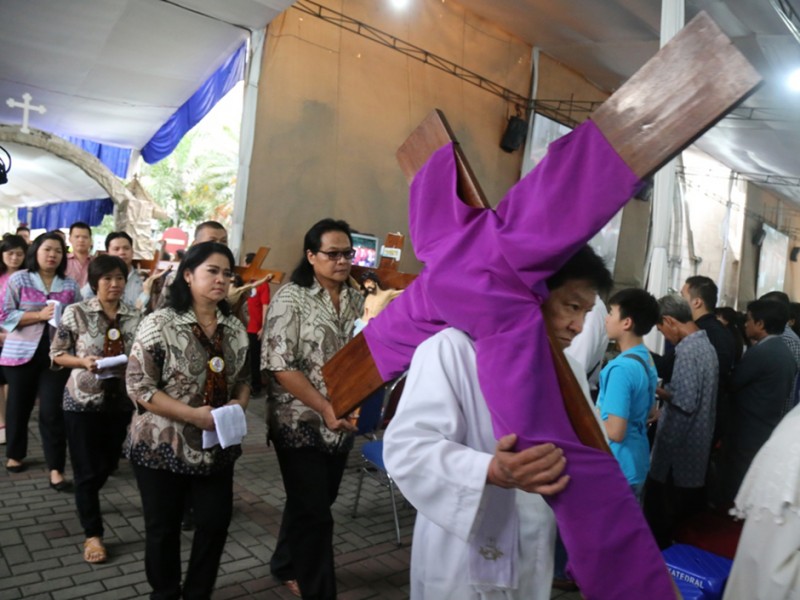 Ribuan umat Kristiani mengikuti ibadat Jumat Agung di Gereja Katedral Jakarta, di Jalan Katedral, Kelurahan Pasar Baru, Kecamatan Sawah Besar, Jakarta Pusat, Jumat (25/03). Ibadat ini untuk merenungkan sengsara dan wafat Isah Almasih dalam menebus dosa umatnya.(Foto: Reza/beritajakarta.com)