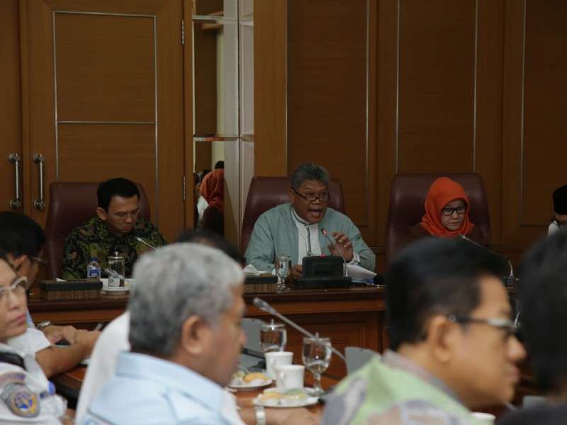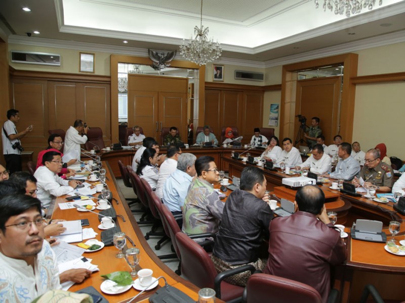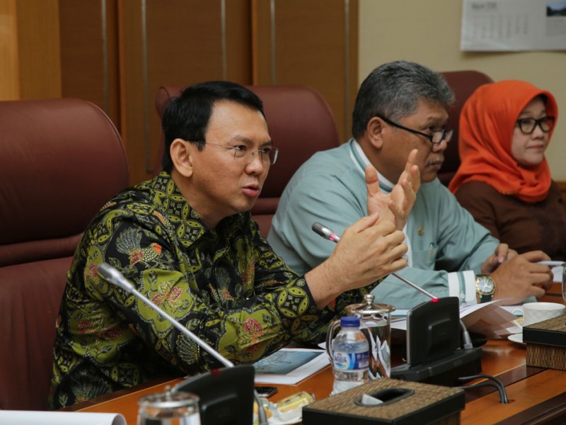 Gubernur DKI Jakarta, Basuki T Purnama, mengikuti rapat penyelesaian permasalahan dermaga PT. Karya Citra Nusantara (KCN) di Balai Kota Jakarta, Kamis (31/3). Rapat ini dihadiri oleh Direktur Pengerukan dan Pelabuhan Kementerian Perhubungan Mauritz H M Sibarani dan Direktur Utama PT. KBN (Persero), H.M Sattar Taba.(Foto: Yopie/beritajakarta.com)