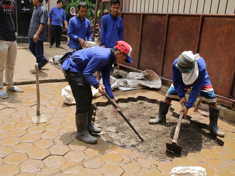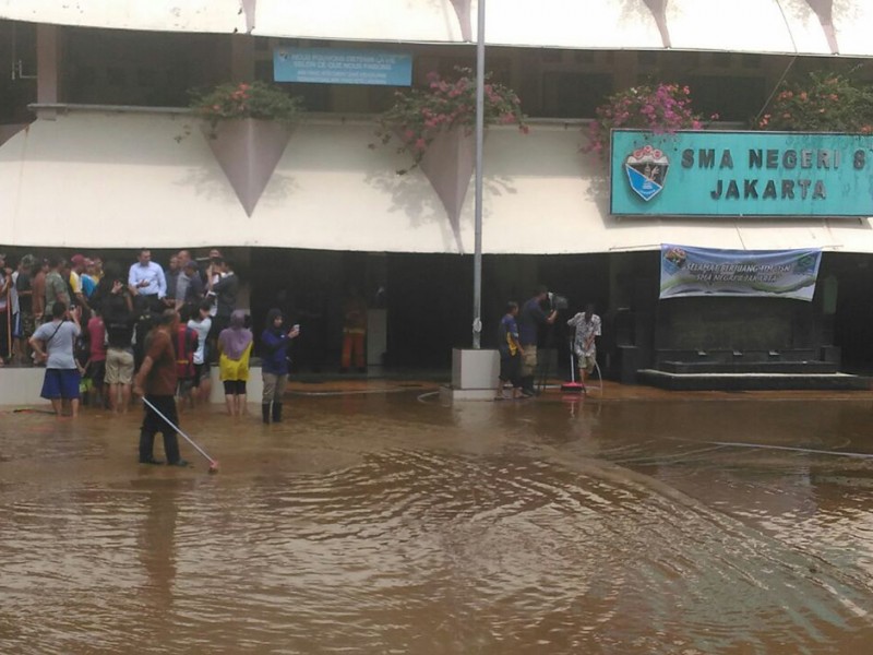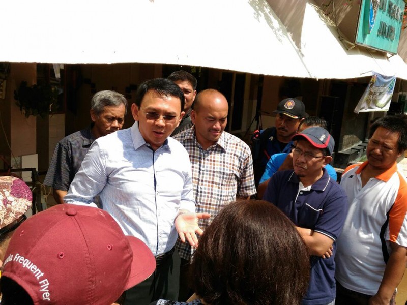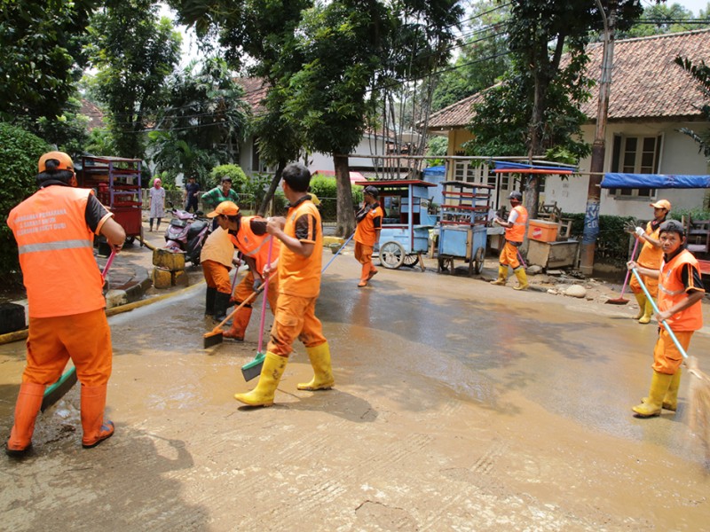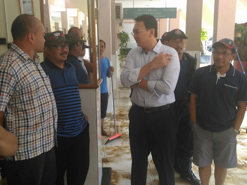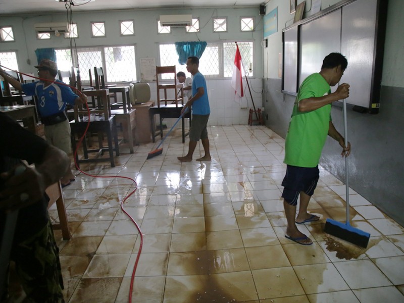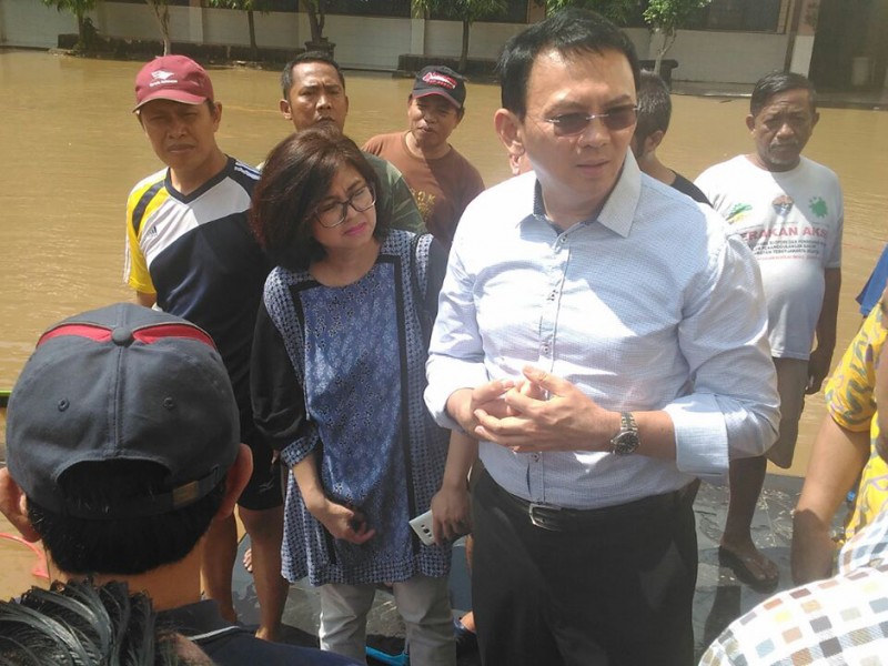 Gubernur DKI Jakarta, Basuki Tjahaja Purnama, meninjau pro ses pembersihan genangan dan lumpur sisa banjir luapan Kali Ciliwung di SMAN 8, Bukit Duri Tebet Jakarta Selatan, Minggu (3/4).(Foto: Yopie/Beritajakarta.com)