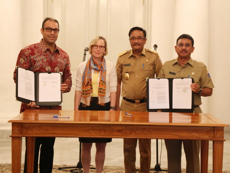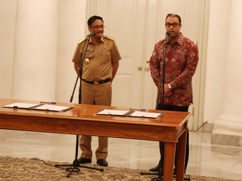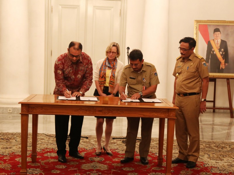 Pemerintah Provinsi DKI Jakarta bersama pihak swasta melakukan penandatanganan kesepakatan bersama program peningkatan kesadaran masyarakat dan kapasitas aparatur bidang kesehatan dalam rangka pencegahan penyakit dan gangguan jiwa di Balai Kota DKI Jakarta, Senin (04/04). (Reza/beritajakarta.com)