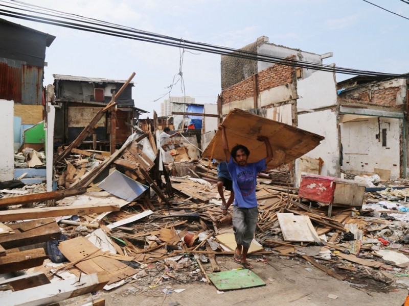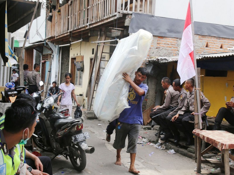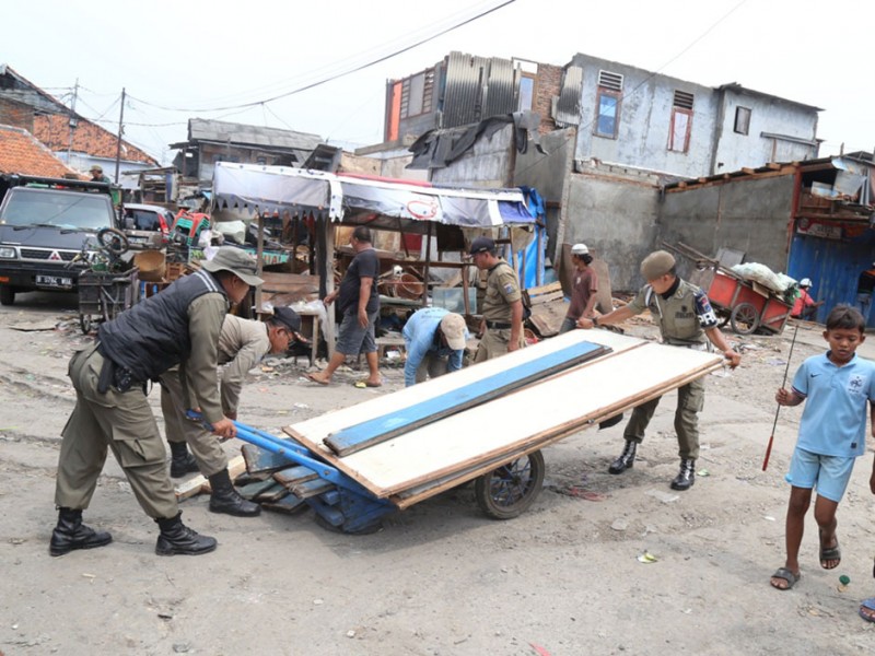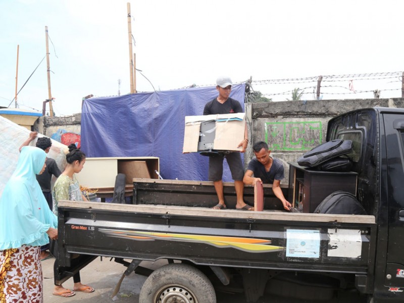 Warga terdampak penataan kawasan Pasar Ikan, Kelurahan Penjaringan, Kecamatan Penjaringan, Jakarta Utara, mulai mengosongkan hunian dan kiosnya, Minggu (10/4/2016). Besok, rencananya Pemprov DKI Jakarta segera melakukan penataan untuk kelancaran pembangunan sheet pile pencegah rob serta meningkatkan estetika kawasan Pasar Ikan agar bisa menjadi kawasan Wisata Bahari. Selain warga yang membongkar sendiri huniannya, nampak personil Satuan Polisi Pamong Praja (Satpol PP) membantu warga memindahkan barang-barangnya untuk diangkut menuju rumah susun (Rusun). (Foto: Reza/Beritajakarta.com)