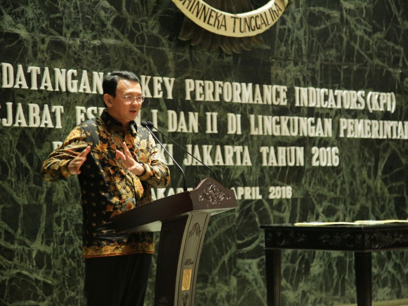 Gubernur DKI Jakarta, Basuki T Purnama, menghadiri Penandatanganan Key Performance Indicator (KPI) yang dilaksanakan oleh seluruh pejabat eselon I dan II di lingkungan Pemprov DKI Jakarta di Balai Kota Jakarta, Jumat (15/4).(Foto: Yopie/Beritajakarta.com)
