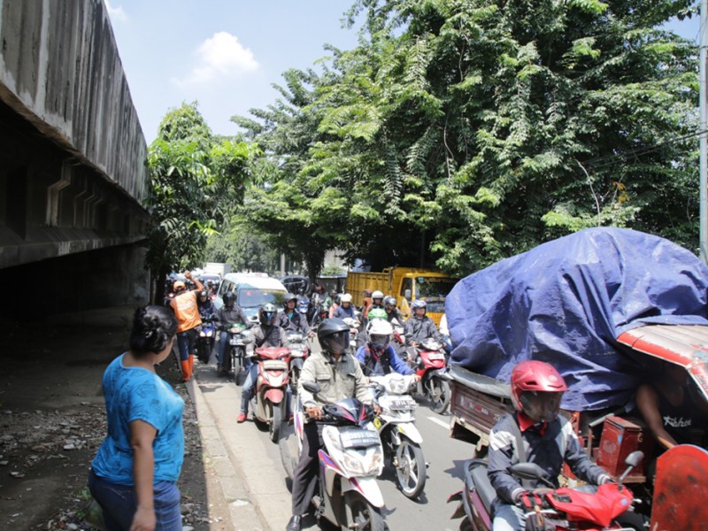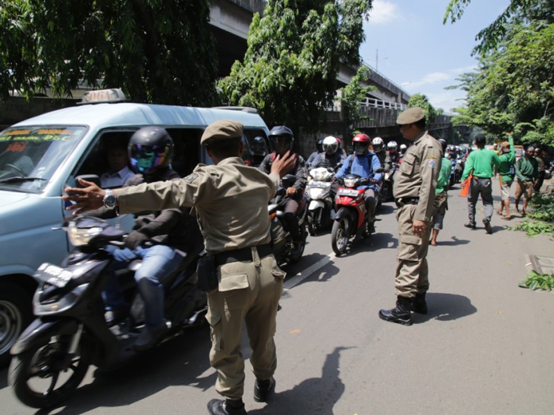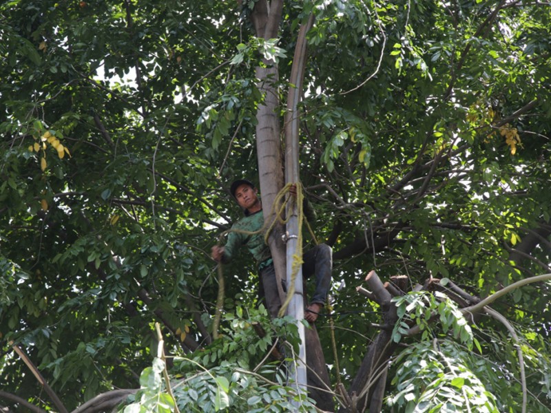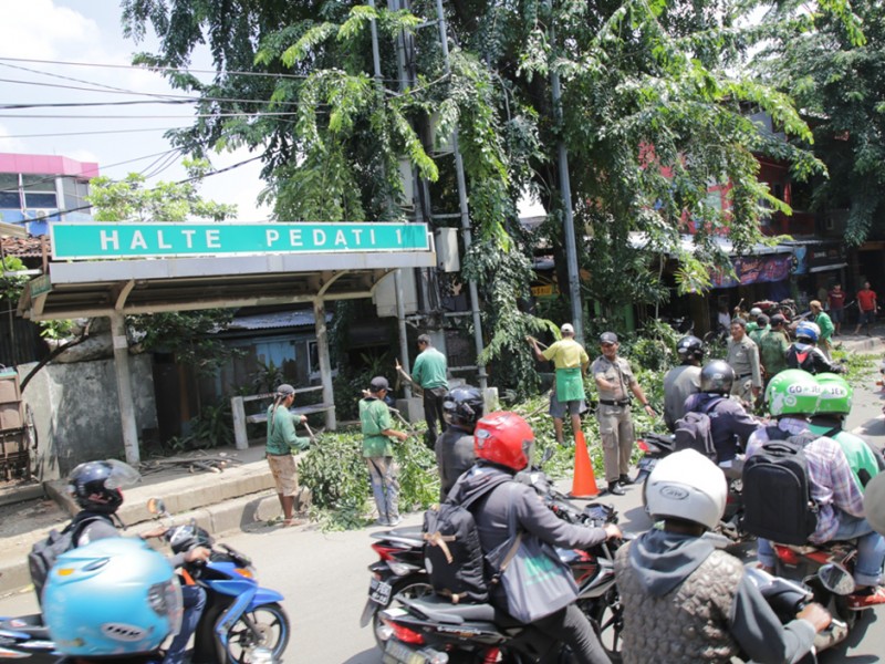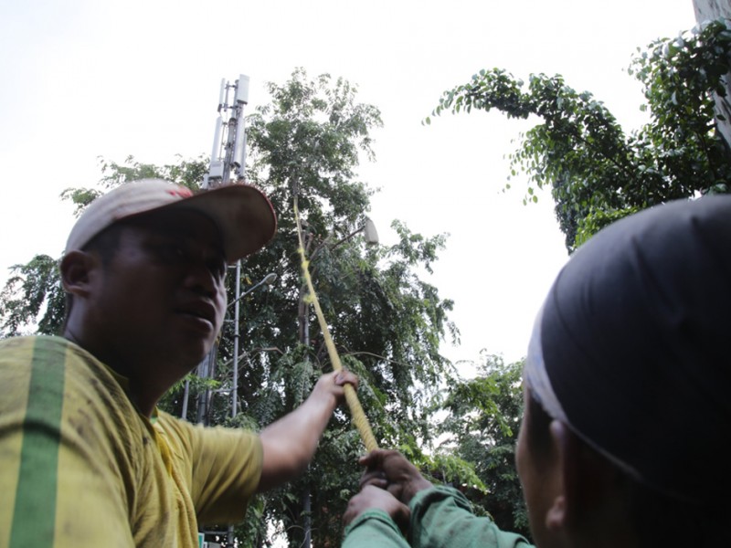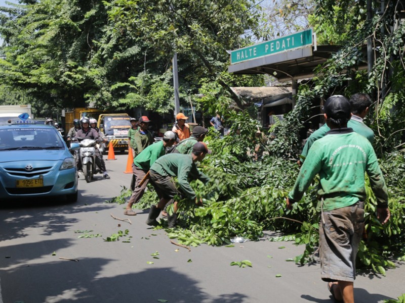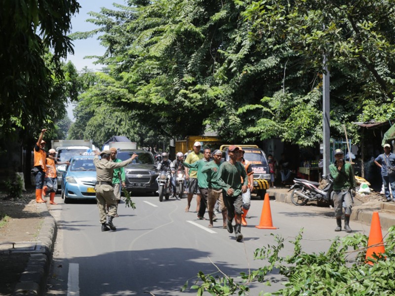 Suku Dinas Pertamanan dan Pemakaman Jakarta Timur melakukan penompingan terhadap sejumlah pohon besar di Jalan D.I Panjaitan, Jakarta Timur, Senin (18/4). Penopingan dilakukan untuk menghindari terjadinya pohon tumbang saat hujan tiba. (Foto: Yopie/Beritajakarta.com)