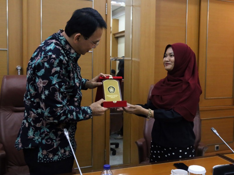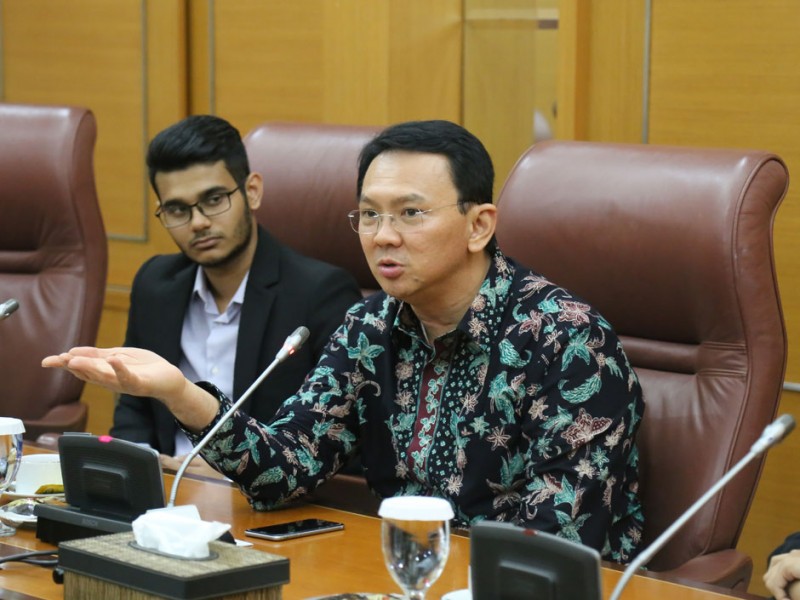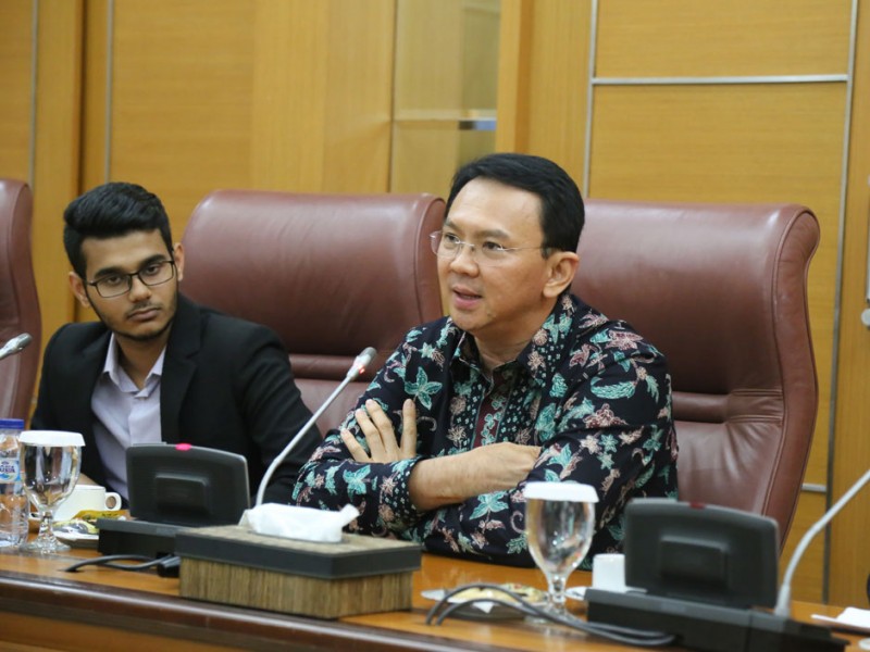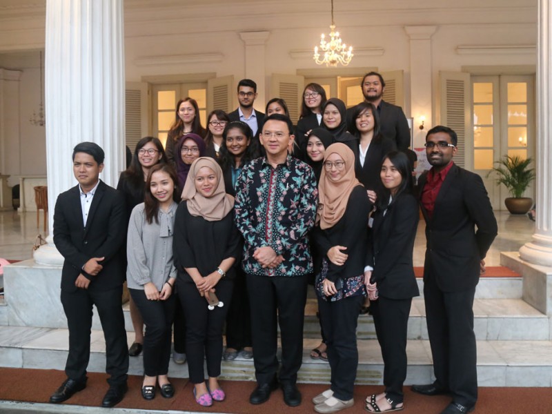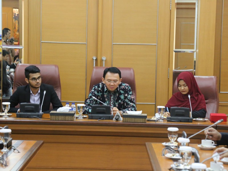 Gubernur DKI Jakarta, Basuki Tjahaja Purnama menerima kunjungan mahasiswa peserta pertukaran pelajar Prince of Songkla University – Thailand dan University Malay – Malaysia di Balai Kota DKI Jakarta, Rabu (20/4). Dalam kesempatan tersebut Basuki memberikan keluluasaan kepada mahasiswa untuk bertanya apa saja tentang Jakarta.(Foto: Reza/beritajakarta.com)