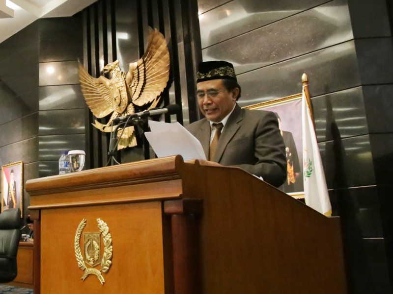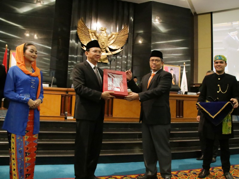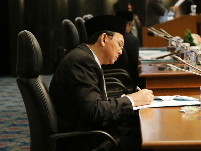 Gubernur DKI Jakarta, Basuki Tjahaja Purnama mendengarkan penyampaian rekomendasi DPRD atas laporan keterangan pertanggungjawaban Gubernur Prov. DKI Jakarta Tahun 2015 di Ruang Rapat Paripurna DPRD DKI Jakarta, Jumat (29/04). (Foto: Yopie/beritajakarta.com)