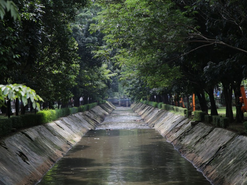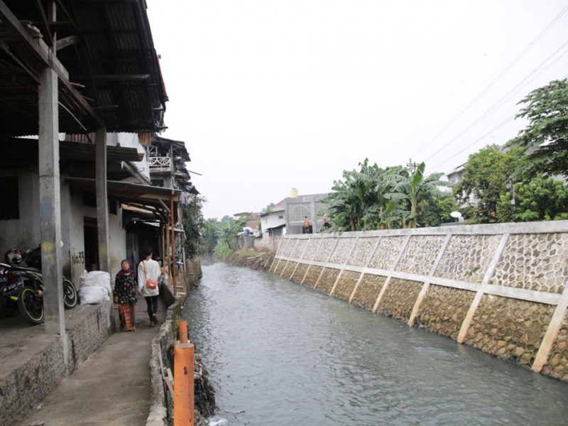 Kali Mampang di kawasan Pondok Jaya, Mampang Prapatan yang bebas dari sampah dengan tanggul yang tinggi