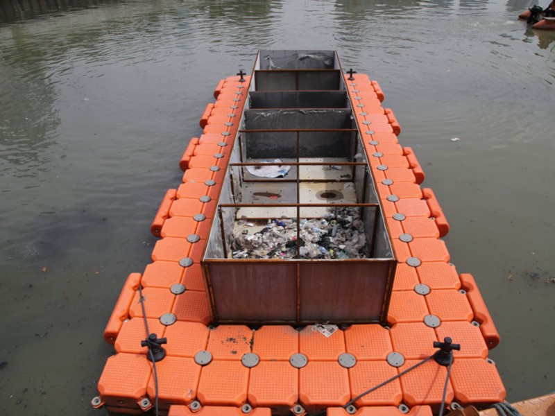 Bak sampah mengapung sebagai tempat pengumpulan sampah sementara setelah sampah diambil dari kali