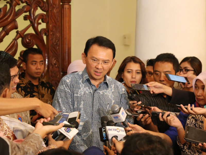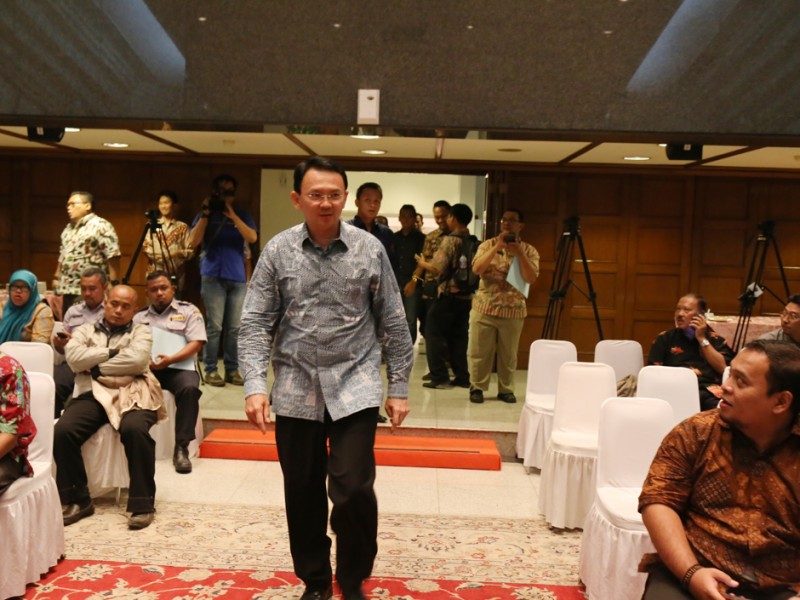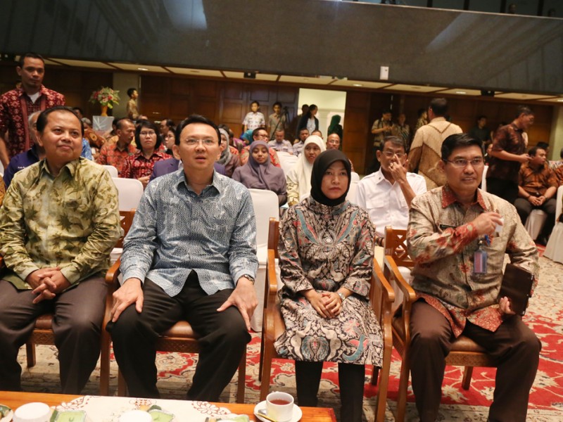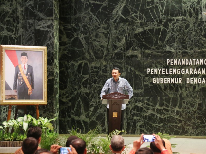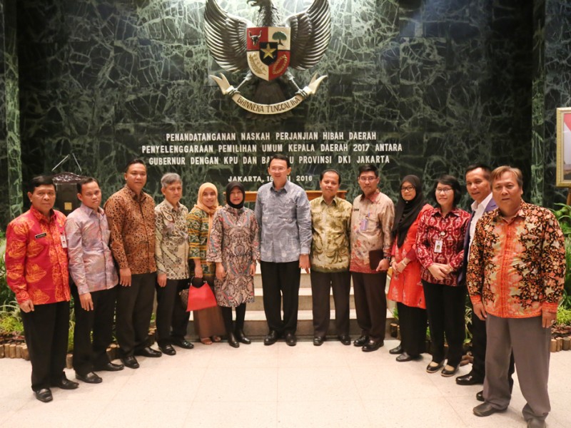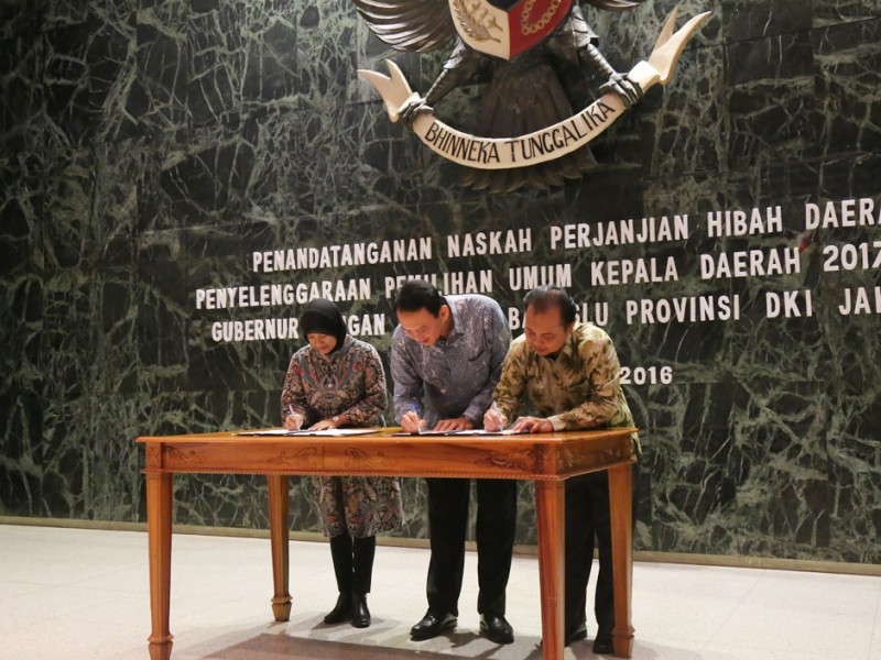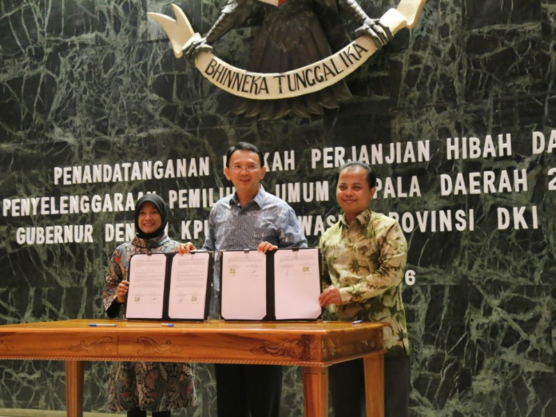 Gubernur DKI Jakarta, Basuki Tjahaja Purnama bersama Ketua Komisi Pemilihan Umum (KPU) Provinsi DKI Jakarta, Sumarno dan Ketua Badan Pengawasan Pemilu (Bawaslu) DKI Jakarta, Mimah Susanti melakukan penandatanganan naskah perjanjian hibah daerah dalam penyelenggaraan Pemilihan Umum Kepala Daerah 2017 di Balai Kota DKI Jakarta, Senin (16/5/2016). (Foto: Reza/beritajakarta.com)