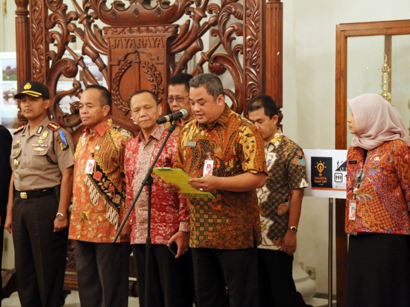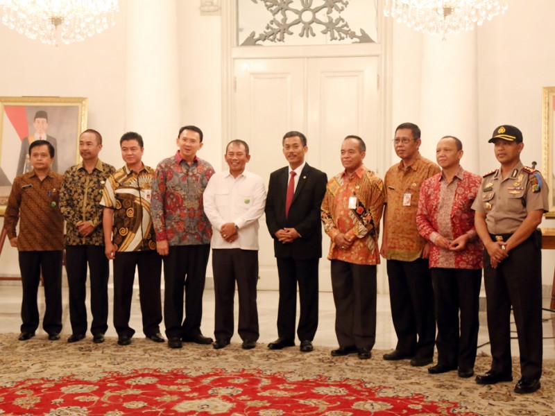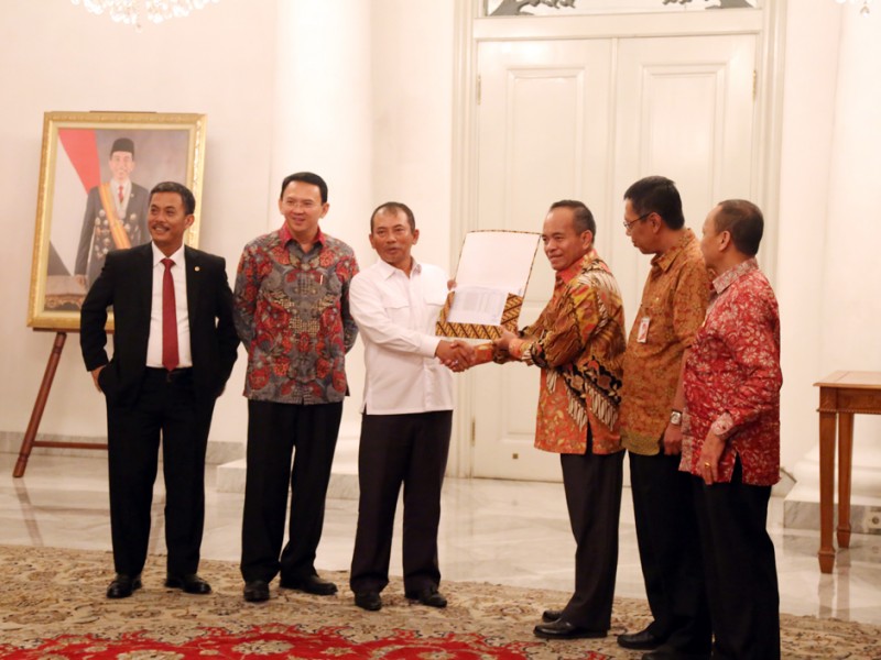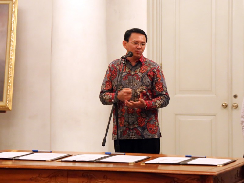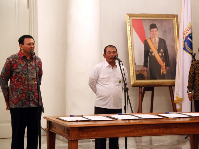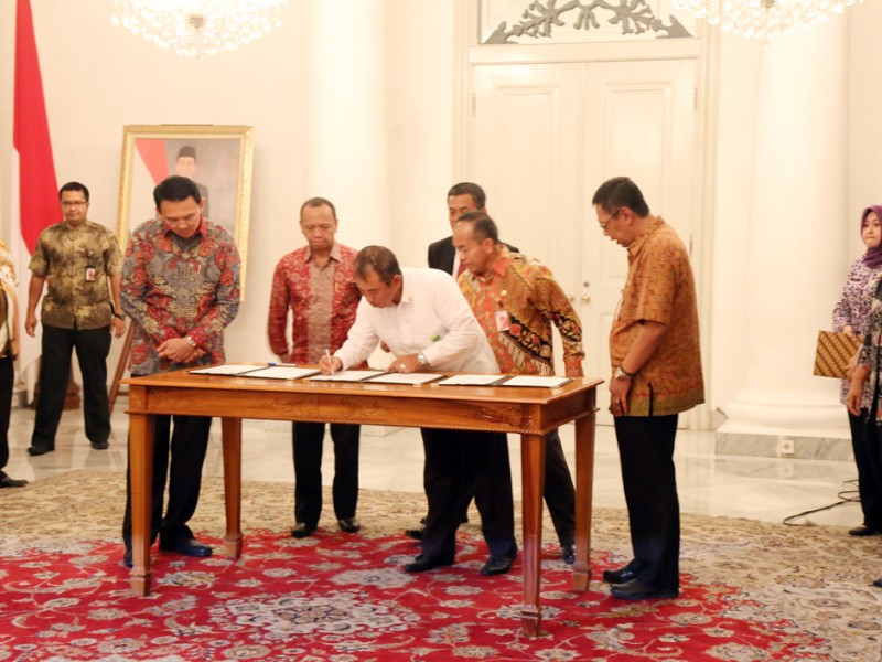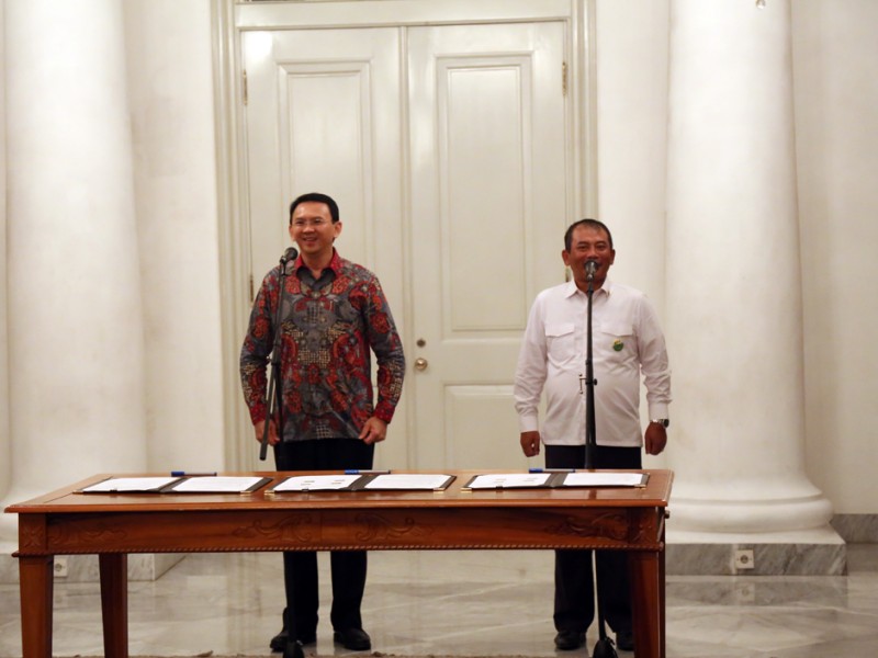 Gubernur DKI Jakarta, Basuki Tjahaja Purnama menyaksikan penandatanganan penambahan batas wilayah di lahan Pemerintah Kota Bekasi kepada Provinsi DKI Jakarta seluas lima hektar, di Balai Kota DKI Jakarta, Selasa (17/05).(Foto: Reza/beritajakarta.com)