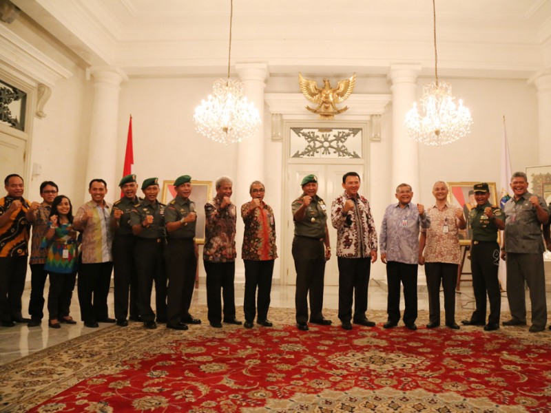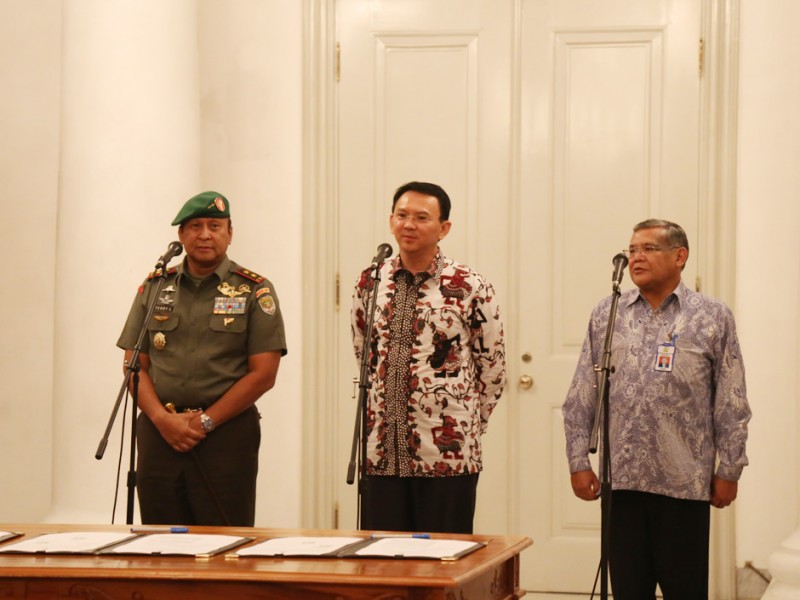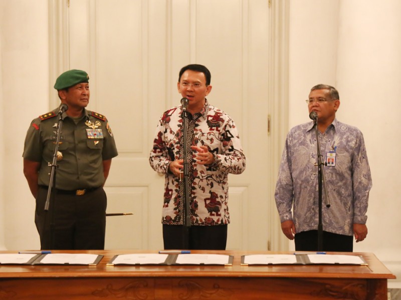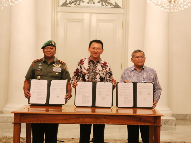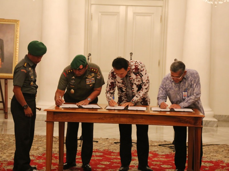 Gubernur DKI Jakarta, Basuki Tjahaja Purnama menandatangani kesepakatan bersama dengan Komando Daerah Militer Jaya / Jayakarta dengan Kementerian Pekerjaan Umum, Perumahan Rakyat RI tentang penggunaan tanah milik TNI AD untuk program normalisasi kali ciliwung di Balai Kota DKI Jakarta, Kamis (19/5). (Foto: Reza/beritajakarta.com)