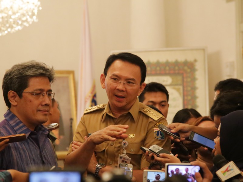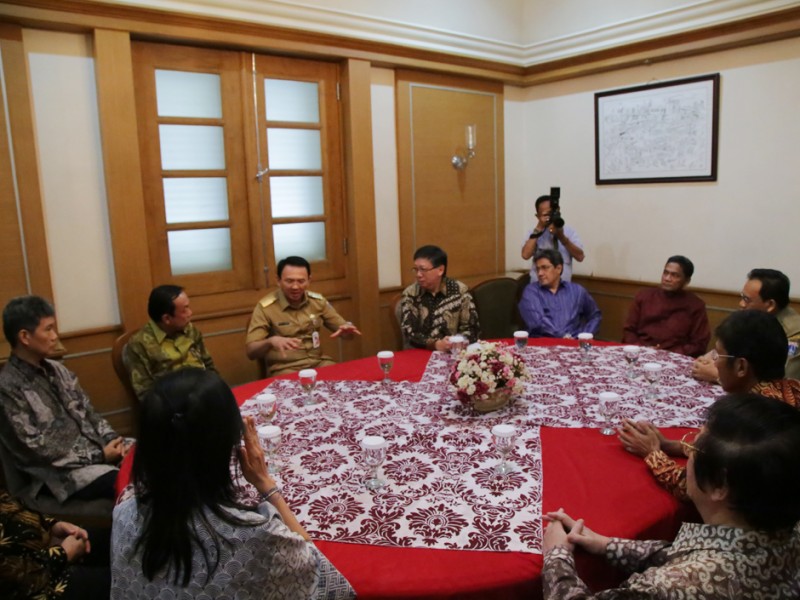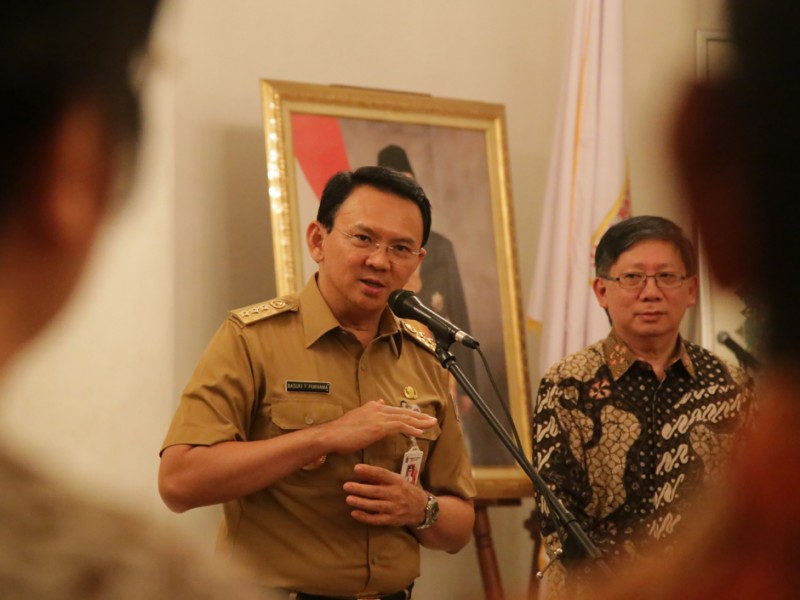 Gubernur DKI Jakarta, Basuki Tjahaja Purnama menyaksikan penandatanganan perjanjian kerjasama antara Pemerintah Provinsi DKI Jakarta dengan PT. Bumi Serpong Damai, Tbk terkait penyediaan fasilitas Ruang Publik Terpadu Ramah Anak (RPTRA) dan Ruang Terbuka Hijau (RTH) di Kawasan Kalijodo di Balai Kota DKI Jakarta, Senin (23/5/2016). Penandatangan perjanjian kerjasama sendiri dilakukan Sekretaris Daerah Provinsi DKI Jakarta, Saefullah bersama Presiden Direktur PT Bumi Serpong Damai, Harry Budi Hartanto. (Foto: Yopie/Beritajakarta.com)