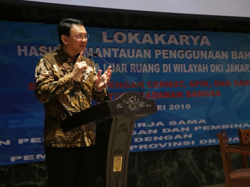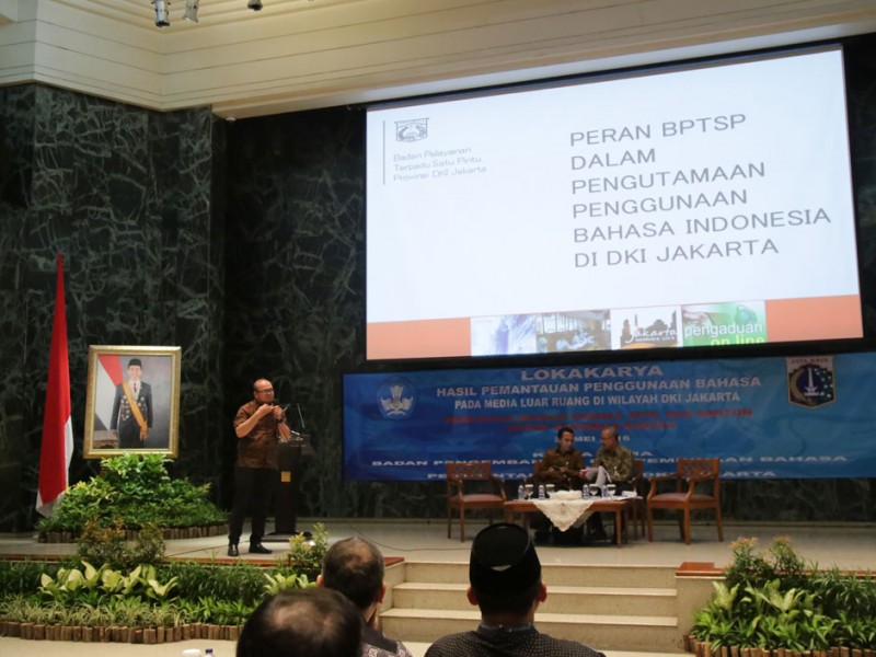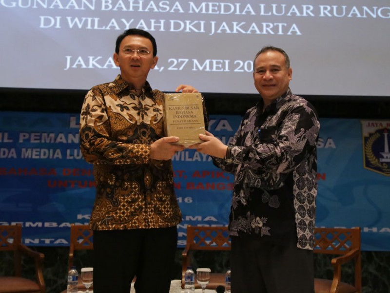Gubernur DKI Jakarta, Basuki Tjahaja Purnama membuka secara resmi Lokakarya Penggunaan Bahasa Indonesia di media luar ruang di Balai Kota DKI Jakarta, Jumat (27/5/2016). Lokakarya dilakukan agar penggunaan bahasa Indonesia khususnya di media luar lebih efektif. Lokakarya ini menghadirkan sejumlah pembicara yakni, Kepala Pusat Pembinaan Badan Pengembangan dan Pembina Bahasa, Gufran Ali Ibrahim; dan perwakilan dari Badan Pelayanan Terpadu Satu Pintu (BPTSP) DKI Jakarta, Bahrul Ulum.(Foto: Yopie/Beritajakarta.com)