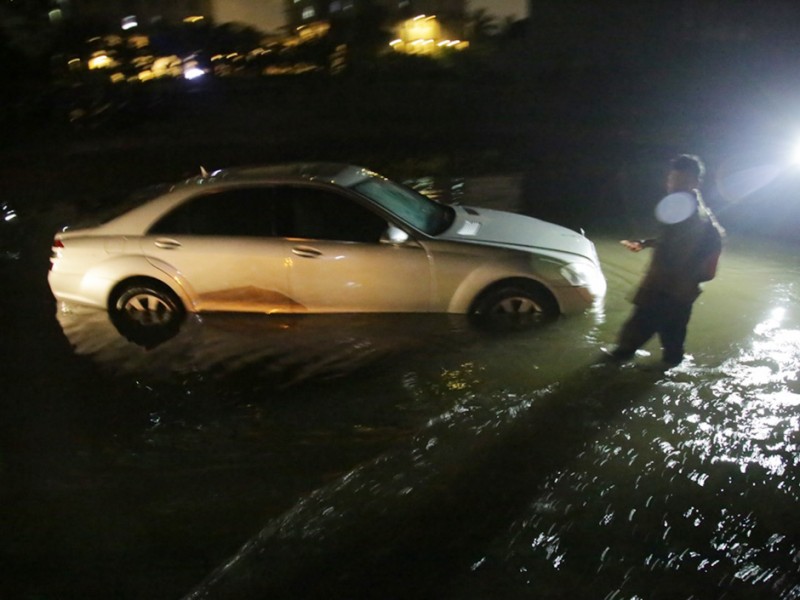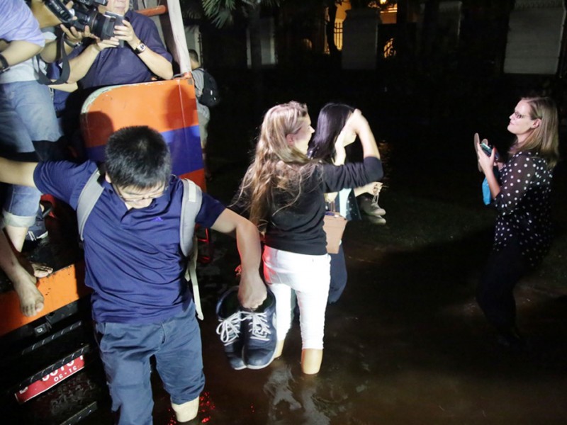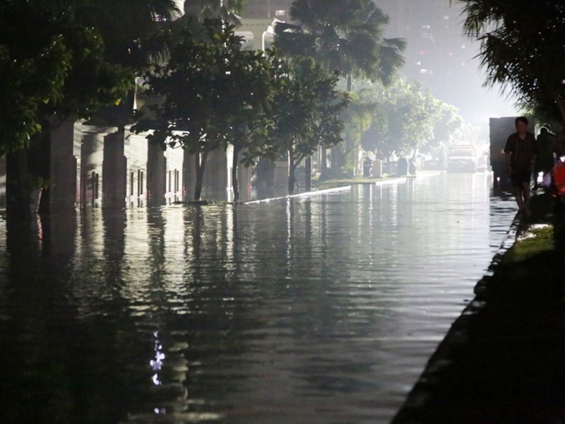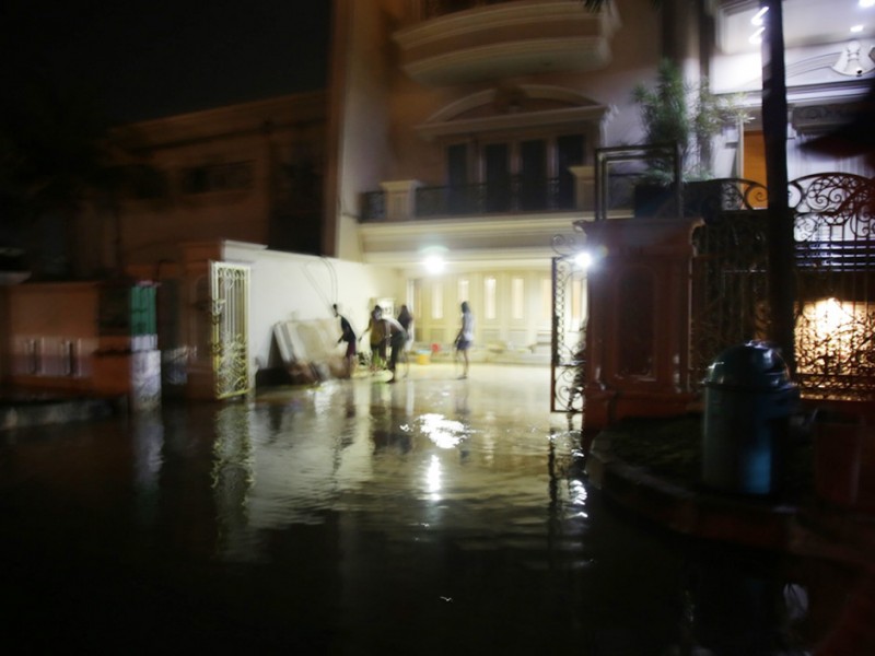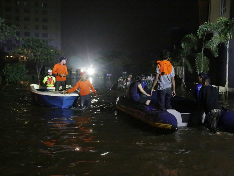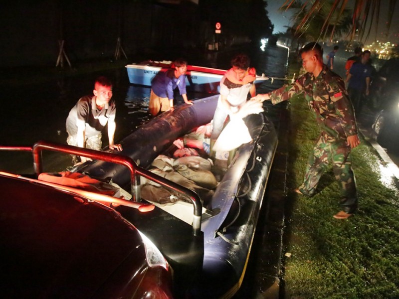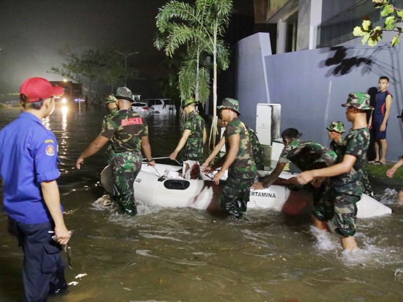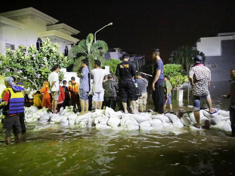 Berbagai unsur SKPD terkait dari Pemprov DKI Jakarta, Kepolisian dan TNI, melakukan penanganan banjir rob akibat jebolnya tanggul di Kawasan Pantai Mutiara, Pluit, Penjaringan, Jakarta Utara, Jumat (3/6). Penanganan difokuskan kepada evakuasi wrga dan pembuatan tanggul darurat. (Foto: Yopie/beritajakarta.com)