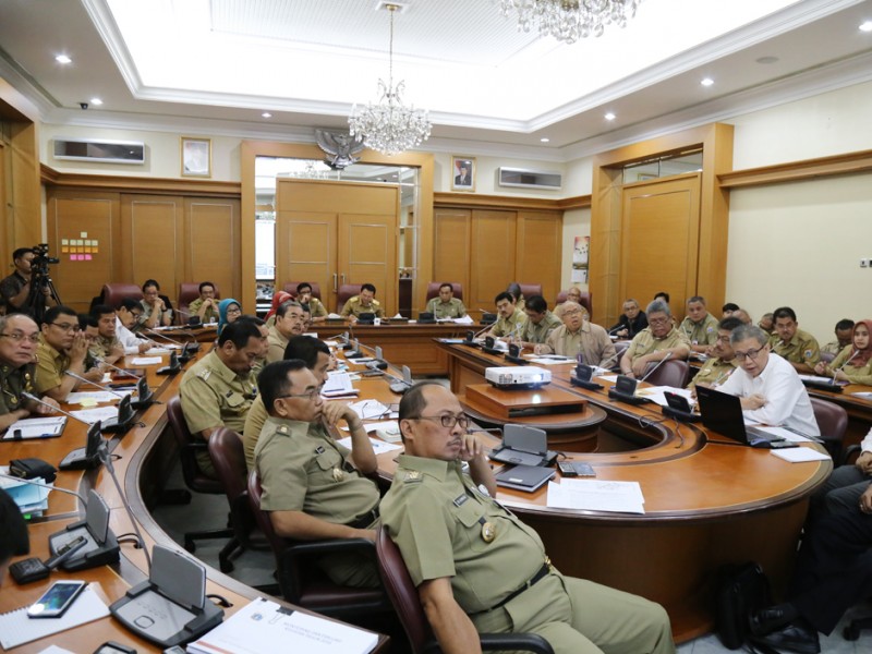 Gubernur DKI Jakarta, Basuki Tjahaja Purnama memimpin rapat bersama jajaran Satuan Kerja Perangkat Daerah (SKPD) di Balai Kota DKI Jakarta, Senin, (13/6). Salah satu fokus pembahasan dalam rapat ini terkait pengaduan masyarakat untuk Transjakarta. (Foto: Reza/beritajakarta.com)