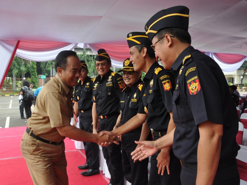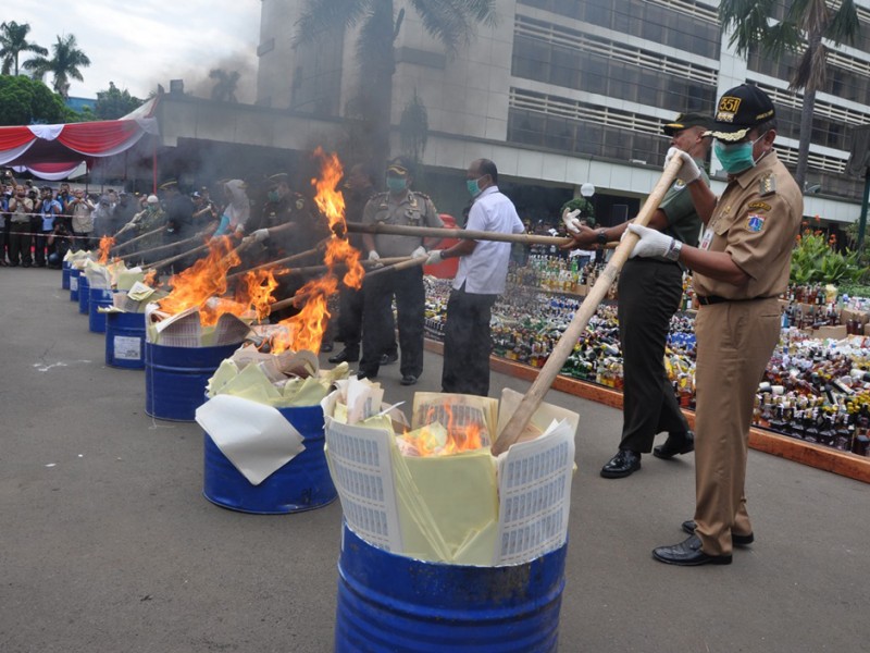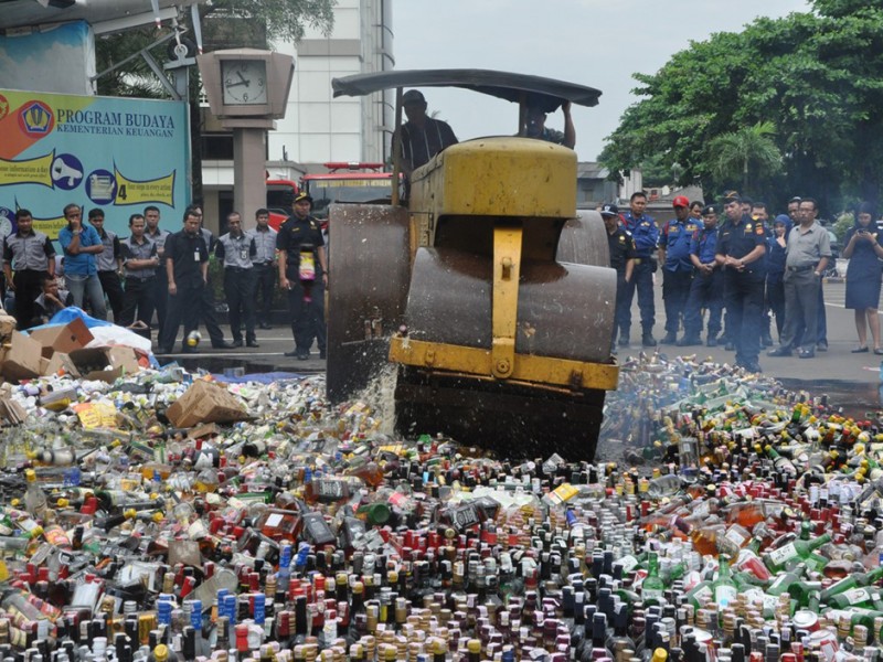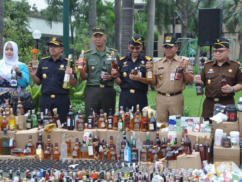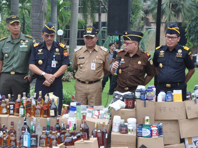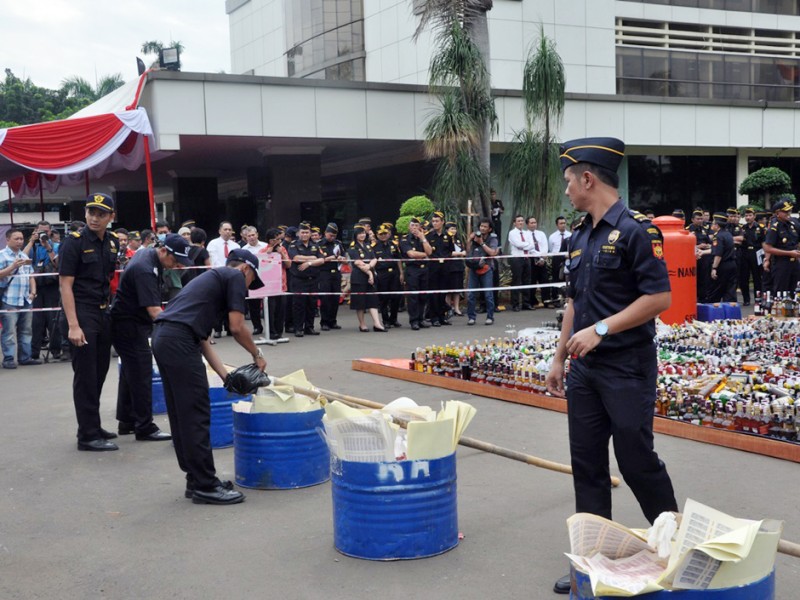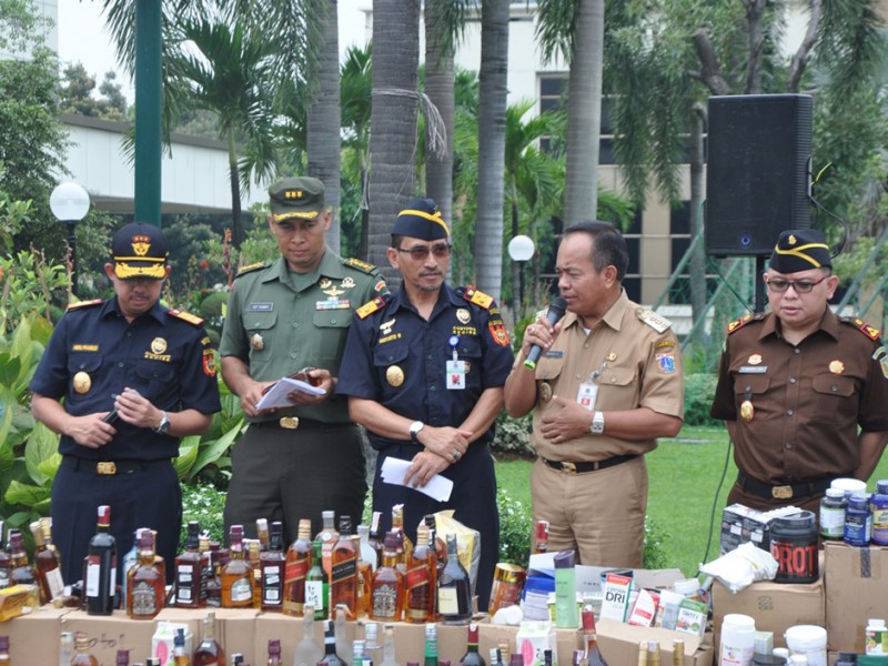 Wali Kota Jakarta Timur, Bambang Musyawardana menghadiri pemusnahan 50.222 botol miras, di halaman Gedung Direktorat Bea dan Cukai, Jl Ahmad Yani, Kecamatan Rawamangun, Jakarta Timur, Senin (20/6). (Foto: Reza/beritajakarta.com)