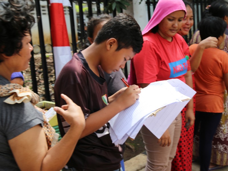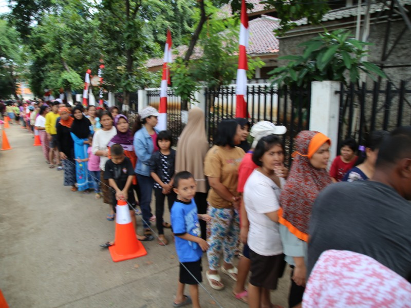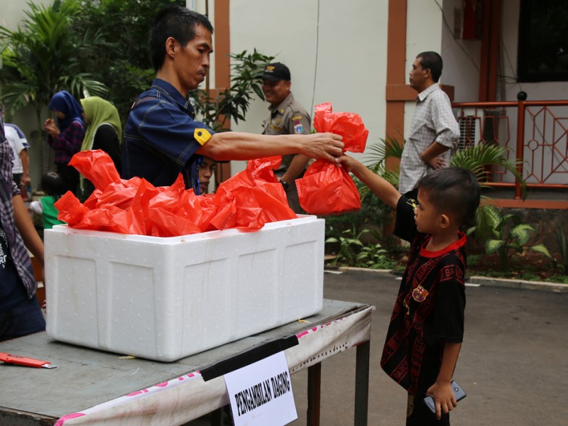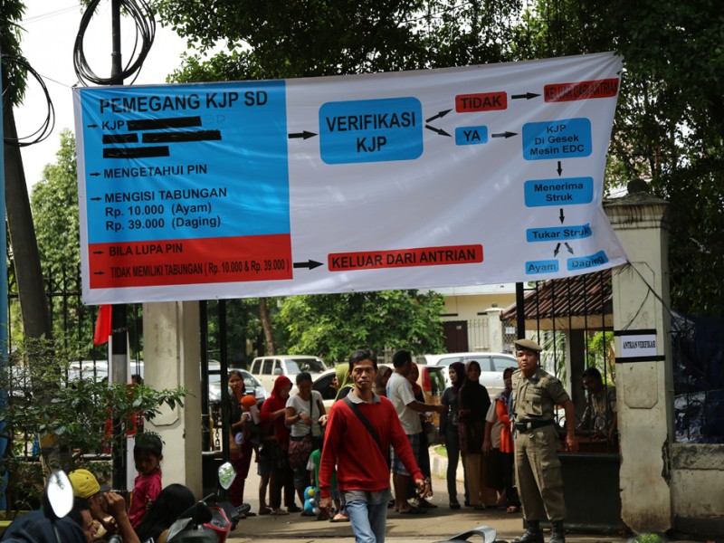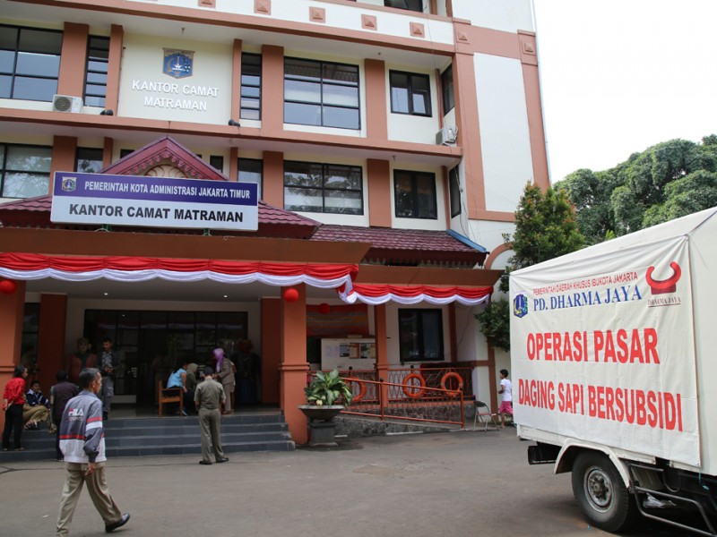 Ribuan warga pemegang Kartu Jakarta Pintar (KJP) mengantre mendapatkan daging bersubsidi di kantor Kecamatan Matraman, Jakarta Timur, Senin (27/6). Sebanyak 1.863 Kg daging sapi dan 980 Kg daging ayam disiapkan Kecamatan Matraman untuk dijual kepada 5.700 pemegang kartu Jakarta Pintar (KJP) Sekolah Dasar (SD) yang berada di wilayah Matraman. (Foto: Yopie/Beritajakarta.com)