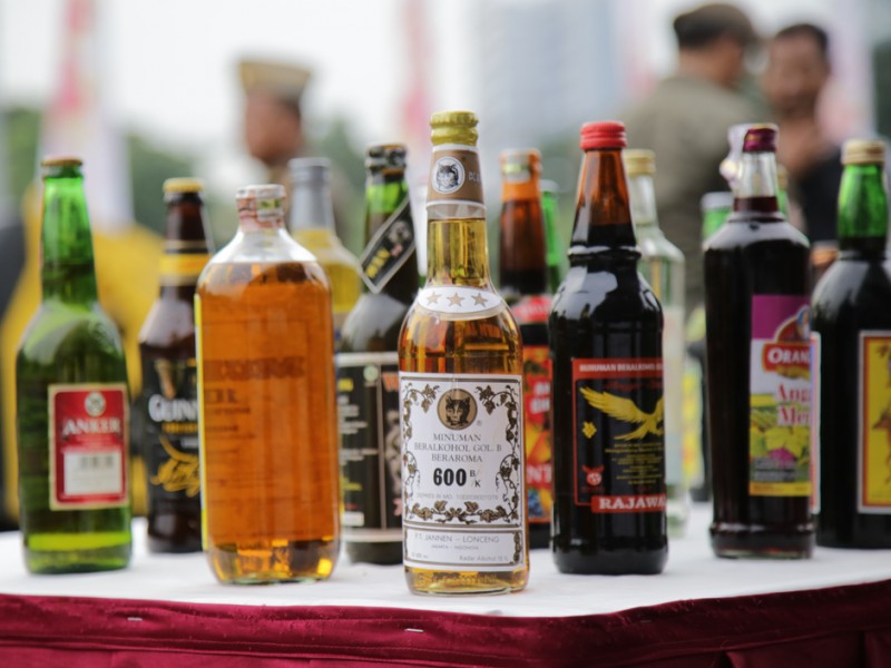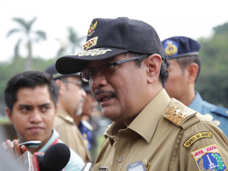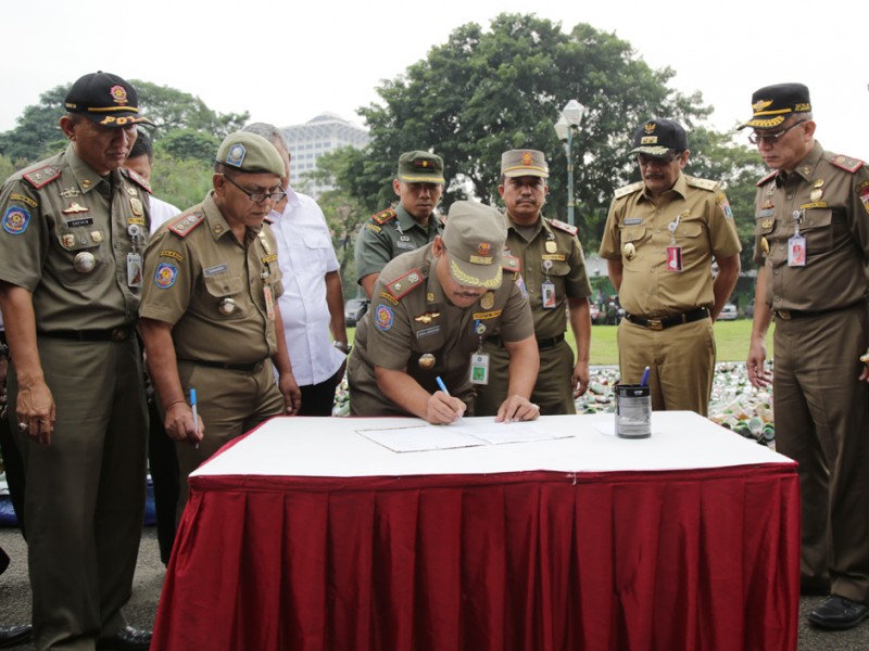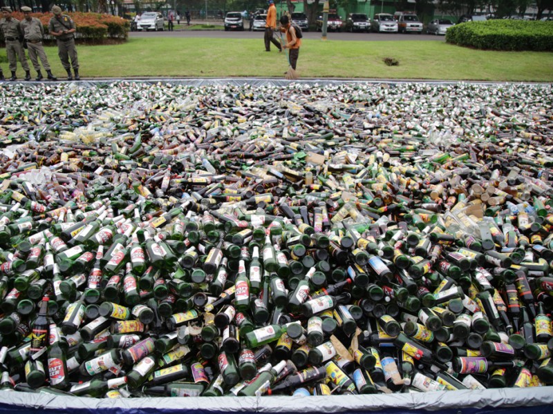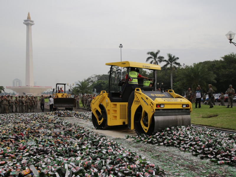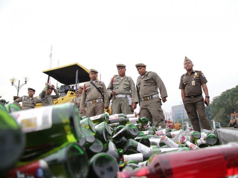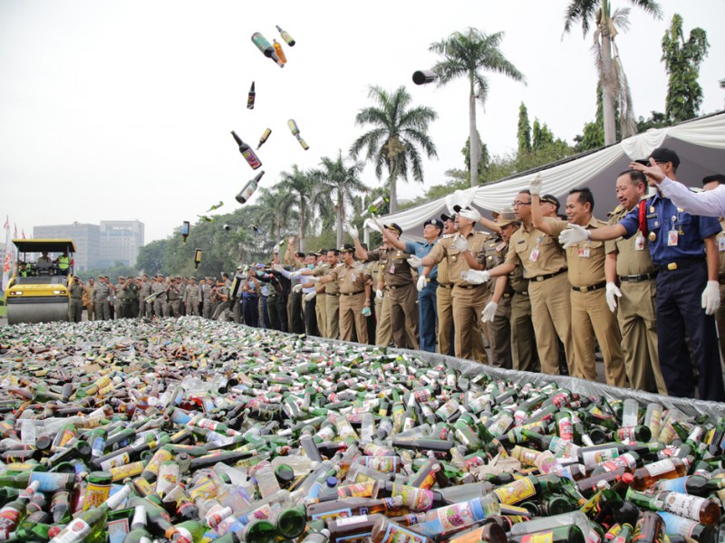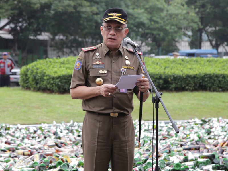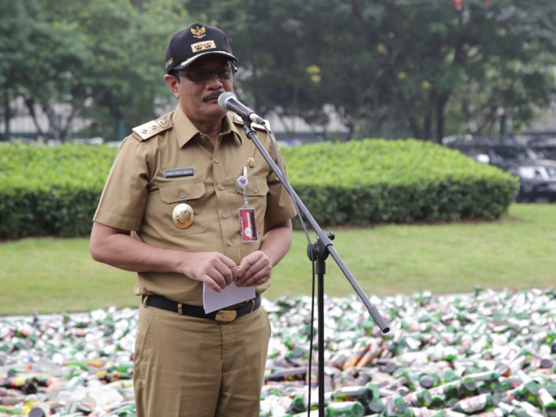 Wakil Gubernur DKI Jakarta, Djarot Saiful Hidayat menghadiri pemusnahan 19.628 botol minuman keras ilegal di Silang Monas Tenggara, Gambir, Jakarta Pusat, Selasa (28/6). Miras tersebut merupakan hasil razia selama 6 bulan terakhir di seluruh wilayah DKI Jakarta. (Foto: Yopie/Beritajakarta.com)