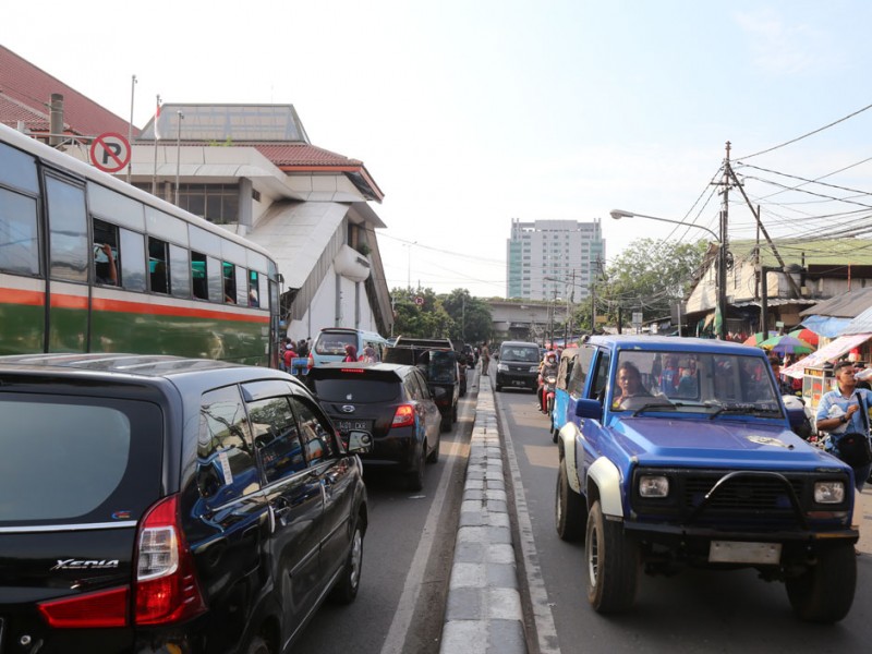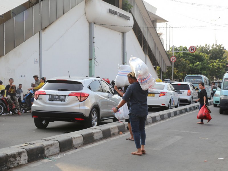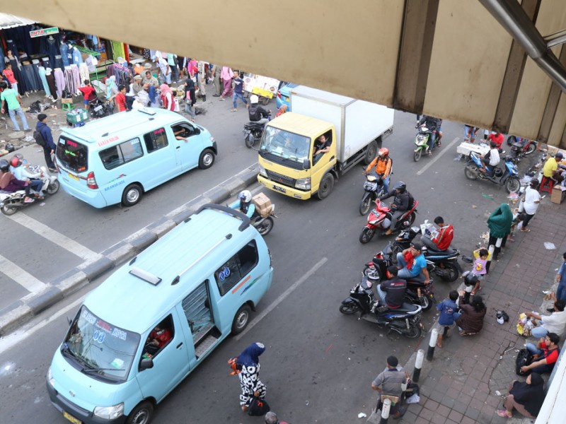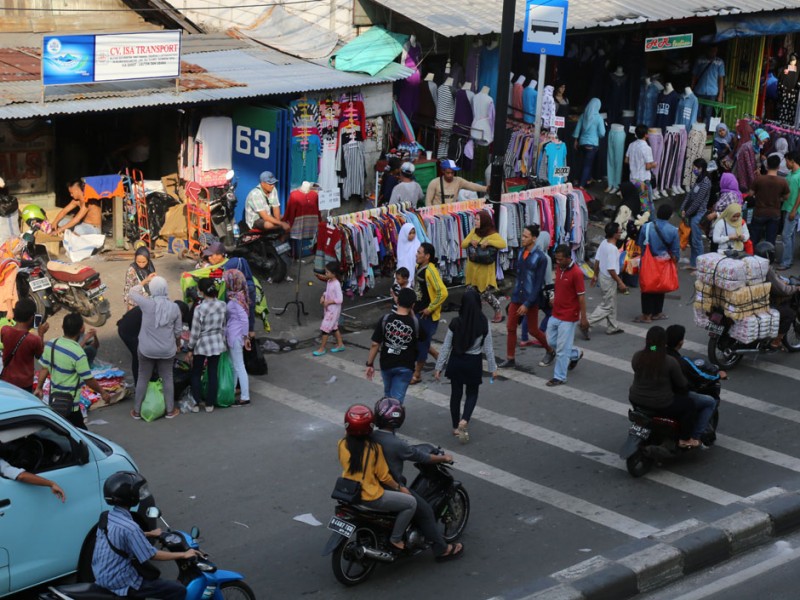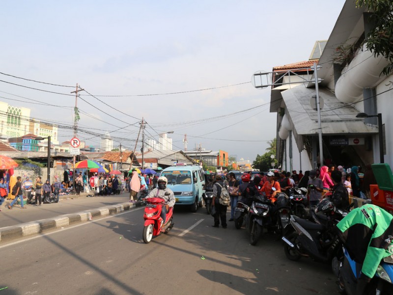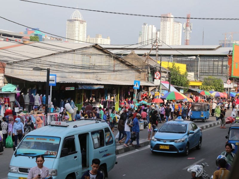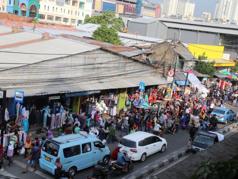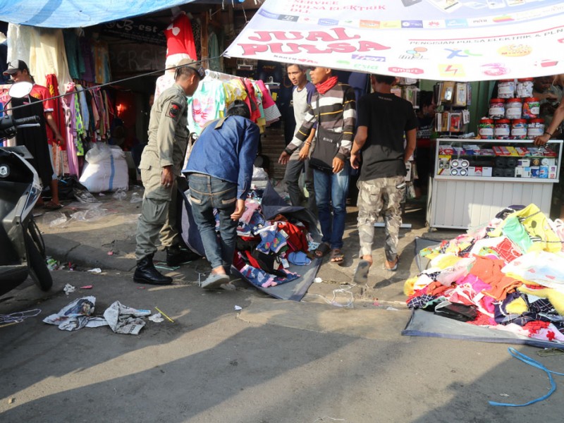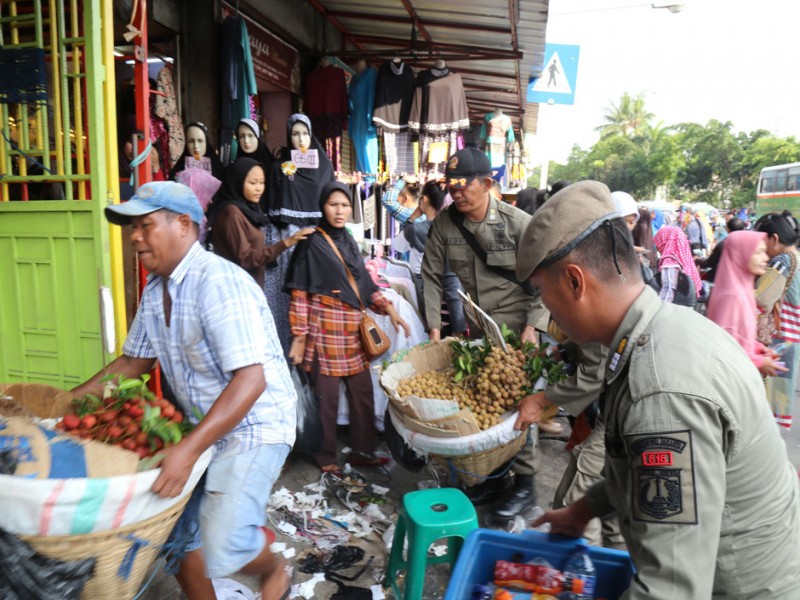 Satuan Polisi Pamong Praja (Satpol PP) melakukan monitoring aktivitas pedagang kali lima dan arus lalu lintas di kawasan Tanah Abang, Jakarta Pusat, Selasa (28/06). Kepadatan kawasan Tanah Abang disebab kan oleh pedagang, ojek dan pengunjung yang hendak dan telah berbelanja kebutuhan lebaran.(Foto: Reza/Beritajakarta.com)