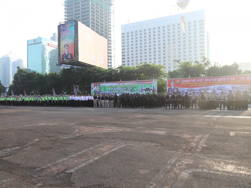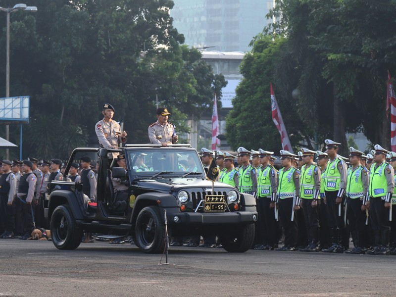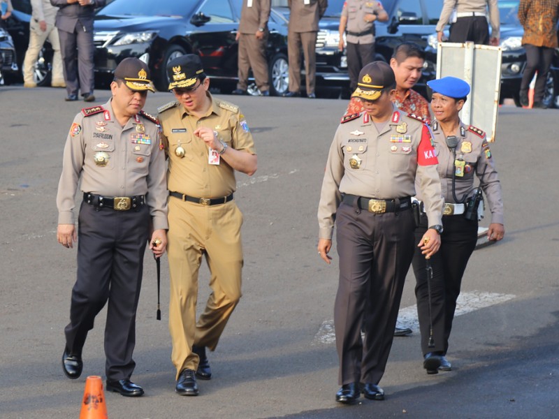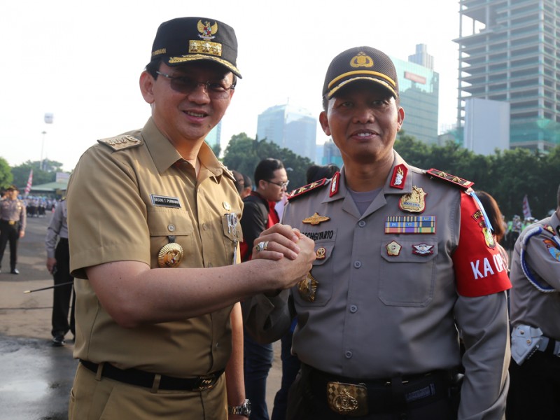 Gubernur DKI Jakarta, Basuki Tjahaja Purnama menghadiri Apel Gelar Pasukan Operasi Kepolisian Ramadniya 2016 dalam Rangka Pengamanan Hari Raya Idul Fitri 1437 H di Lapangan Dit Lantas Polda Metro Jaya, Jakarta Selatan, Kamis (30/06). (Foto: Reza/Beritajakarta.com)