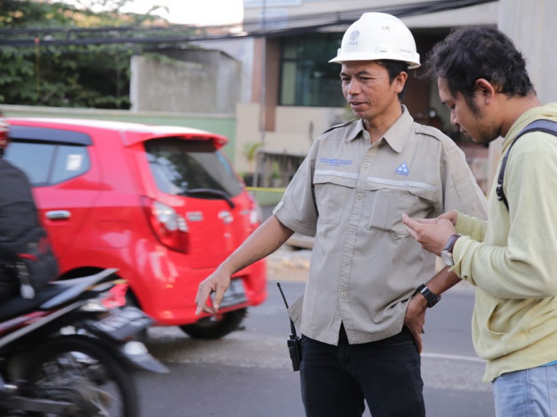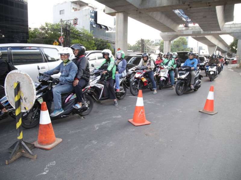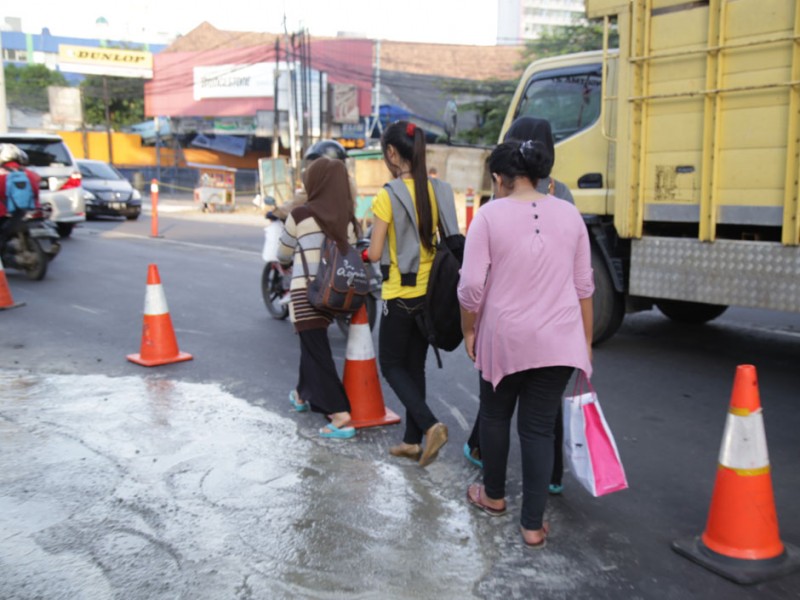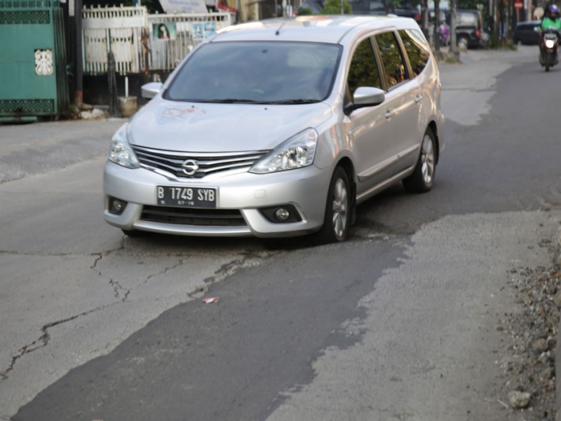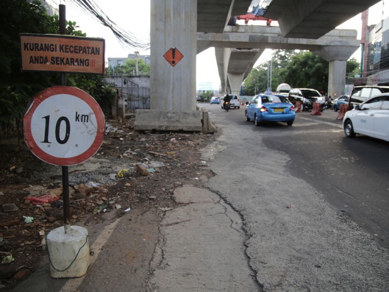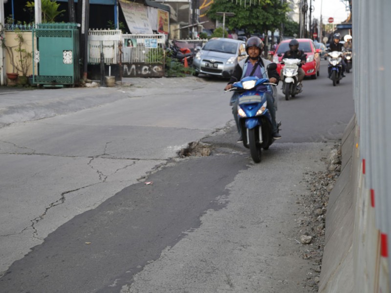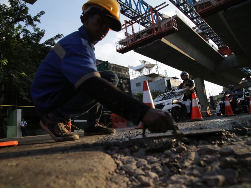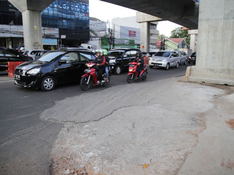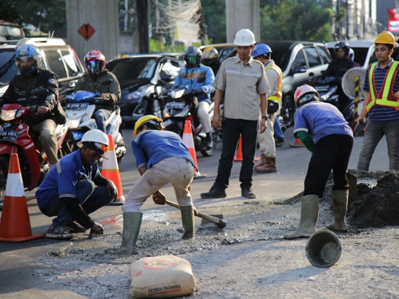 Sebanyak lima titik jalan rusak akibat dilintasi kendaraan berat proyek pengerjaan jalan layang Transjakarta di Jalan Wolter Monginsidi, Kelurahan Rawa Barat, Kebayoran Baru, Jakarta Selatan, diperbaiki Jumat (15/7).(Foto: Yopie/Beritajakarta.com)