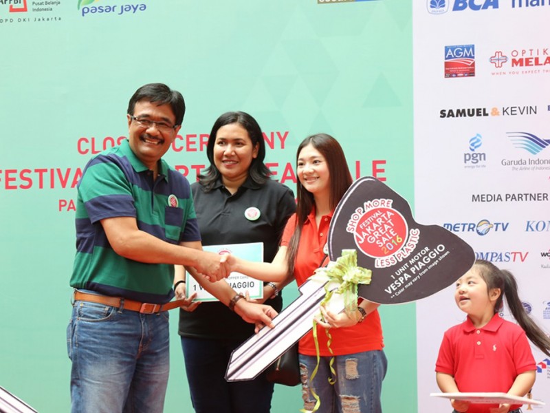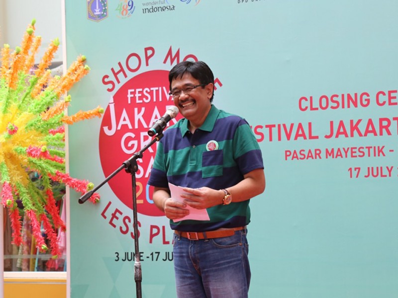 Pelaksanaan Festival Jakarta Great Sale (FJGS) Tahun 2016 sebagai rangkaian kegiatan memperingati HUT ke-487 DKI Jakarta resmi ditutup. Seremonial penutupan FJGS Tahun 2016 dilakukan Wakil Gubernur DKI Jakarta, Djarot Saiful Hidayat, di Pasar Mayestik, Jakarta Selatan, Minggu (17/7/2016). Adapun nilai transaksi dalam pelaksanaan FJGS Tahun 2016 selama 1,5 bulan mencapai Rp 15,7 triliun di pasar modern (mal) dan Rp 15 miliar di pasar tradisional. (Foto: Reza/beritajakarta.com)