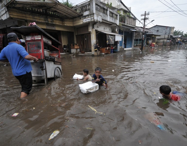 Hujan deras yang mengguyur Jakarta Selatan sejak siang hari mengakibatkan debit Kali Mampang meningkat dan merendam pemukiman warga di kawasan Kemang Utara IX setingi 60 cm, Rabu (20/7). (Foto: Reza/beritajakarta.com)