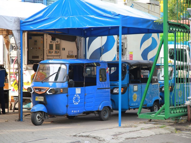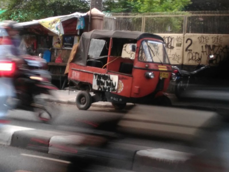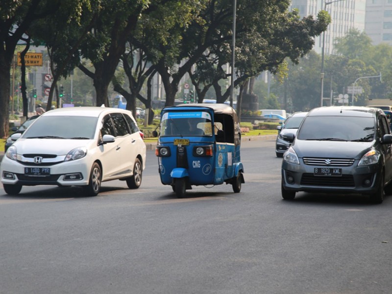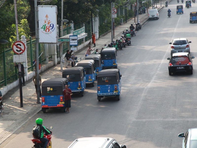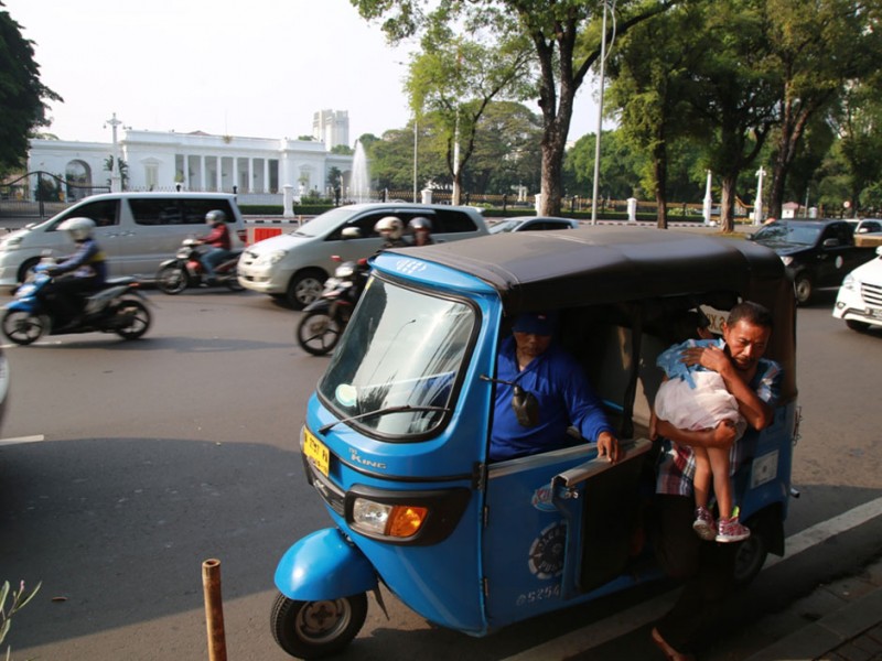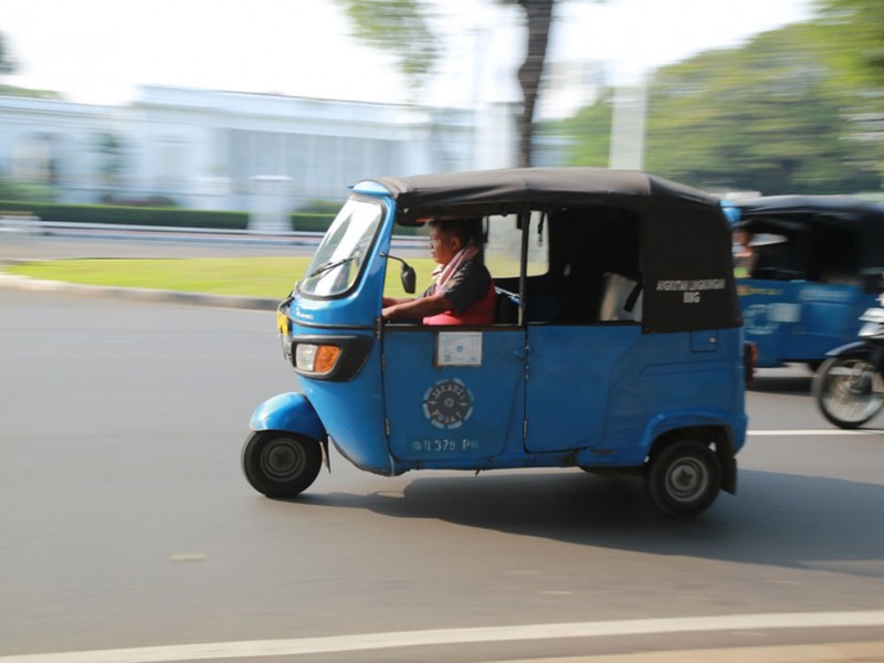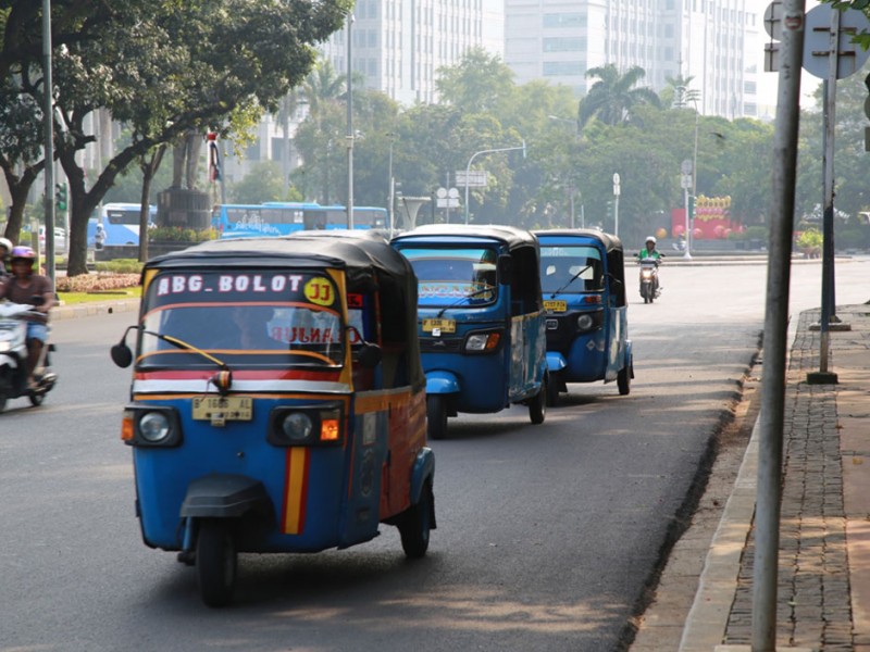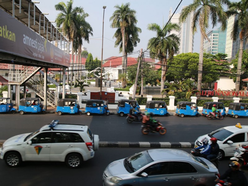 Sejumlah bajaj berbahan bakar gas (BBG) beroperasi normal di kawasan Jalan Medan Merdeka Utara, Jakarta Pusat, Selasa (26/7). Sebelumnya Suku Dinas Perhubungan dan Transportasi Jakarta Pusat menyiapkan sosialisasi larangan bagi bajaj untuk melintas di kawasan Medan Merdeka Utara dan mengetem disejumlah titik di kawasan Monas yang berujung pada gangguan lalu lintas.(Foto: Yopie/Beritajakarta.com)