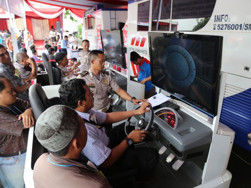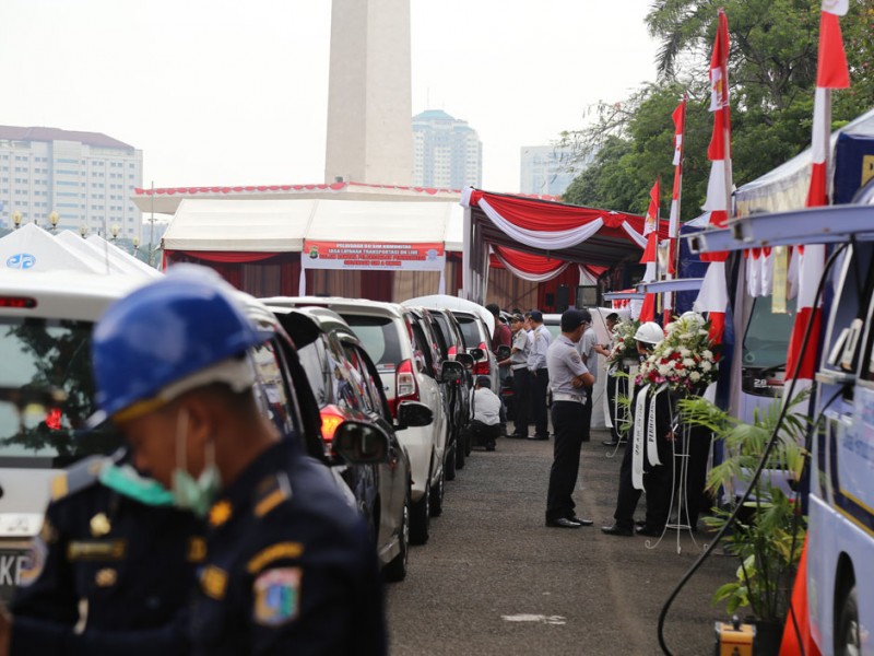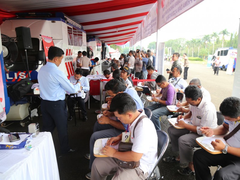 Dinas Perhubungan dan Transportasi DKI Jakarta bersama Kementerian Perhubungan (Kemenhub) RI dan Direktorat Lalu Lintas (Dirlantas) Polda Metro Jaya membuka layanan uji Kir dan SIM A Umum untuk taksi berbasis aplikasi (taksi online) dan taksi konvensional di lapangan Monumen Nasional (Monas), Gambir, Jakarta Pusat, Senin (15/8).(Foto: Reza/beritajakarta.com)
