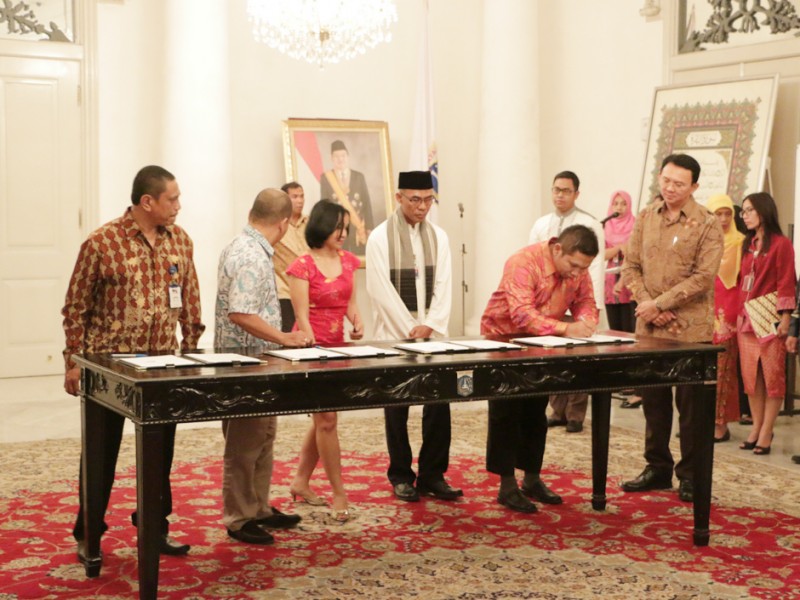 Gubernur DKI Jakarta, Basuki Tjahaja Purnama menyaksikan penandatanganan perjanjian kerja sama Dinas Penanggulangan Kebakaran dan Penyelamatan DKI Jakarta terkait informasi penanggulangan dan penanganan kebakaran dengan 6 Radio di Balai Kota DKI Jakarta, Kamis (18/8/2016). Ke-6 radio tersebut yakni, Radio Republik Indonesia (RRI), Radio Sonora, Bens Radio, Gen FM, Jak FM dan Elshinta. (Foto: Yopie/Beritajakarta.com)