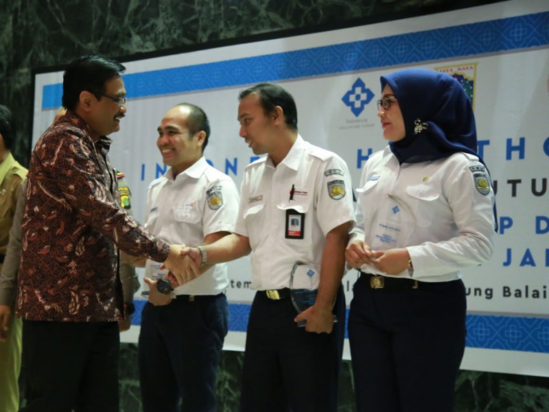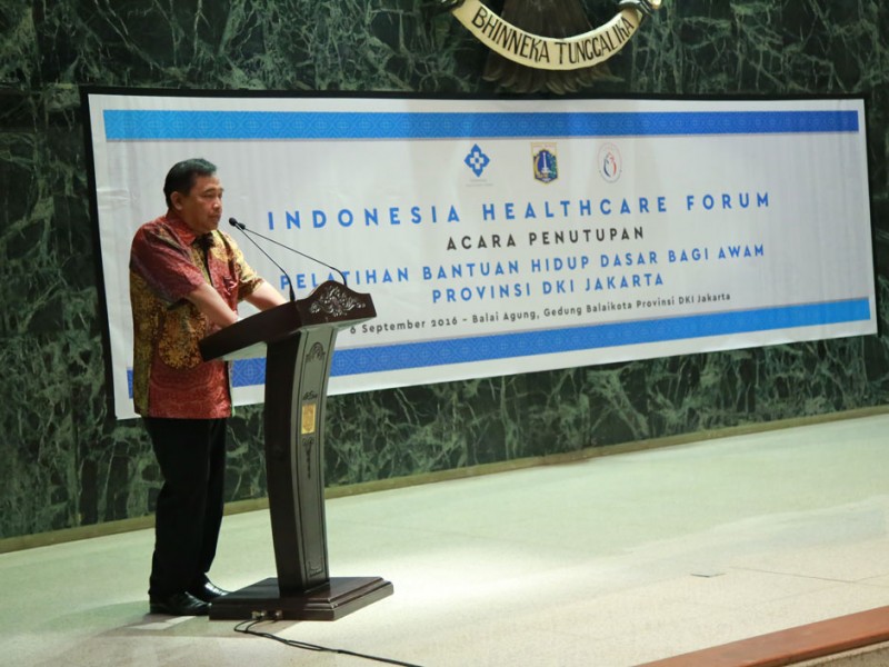 Wakil Gubernur DKI Jakarta, Djarot Saiful Hidayat menutup Pelatihan Bantuan Hidup Dasar Peserta Awam Provinsi DKI Jakarta di Balai Kota Jakarta, Selasa (6/9). Dalam acara ini para peserta pelatihan menggelar simulasi pemberia bantuan hidup dasar dan penggunaan alat kejut jantung.(Foto: Yopie/Beritajakarta.com)