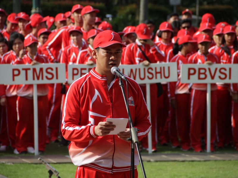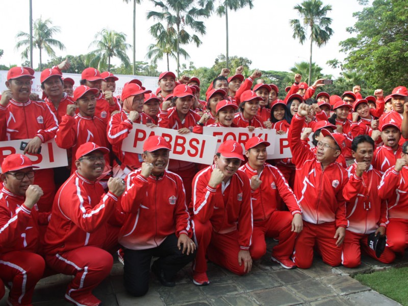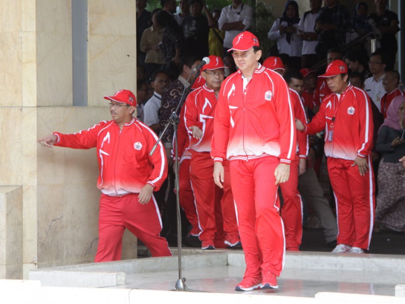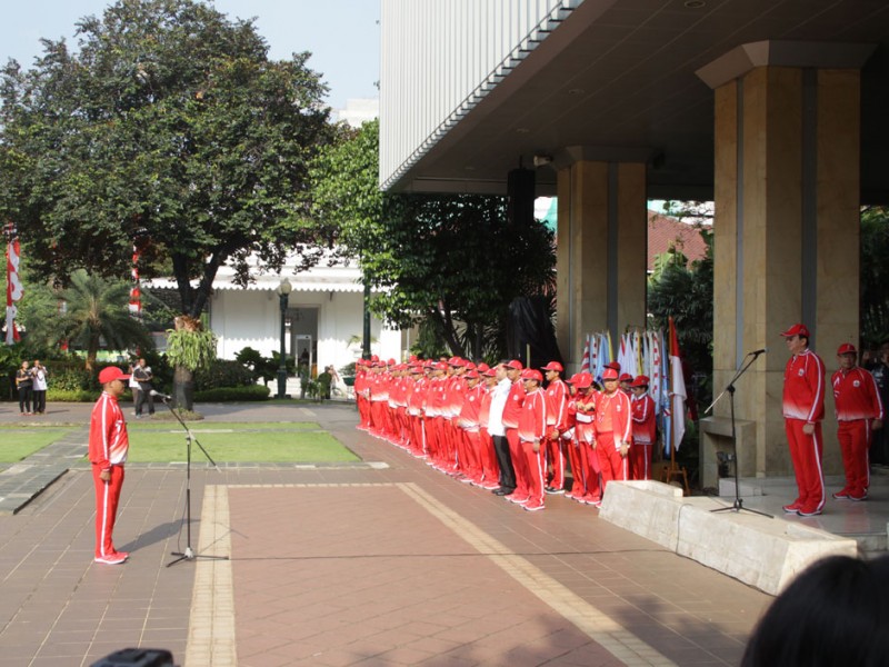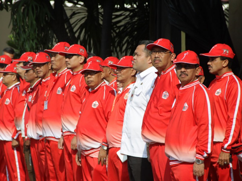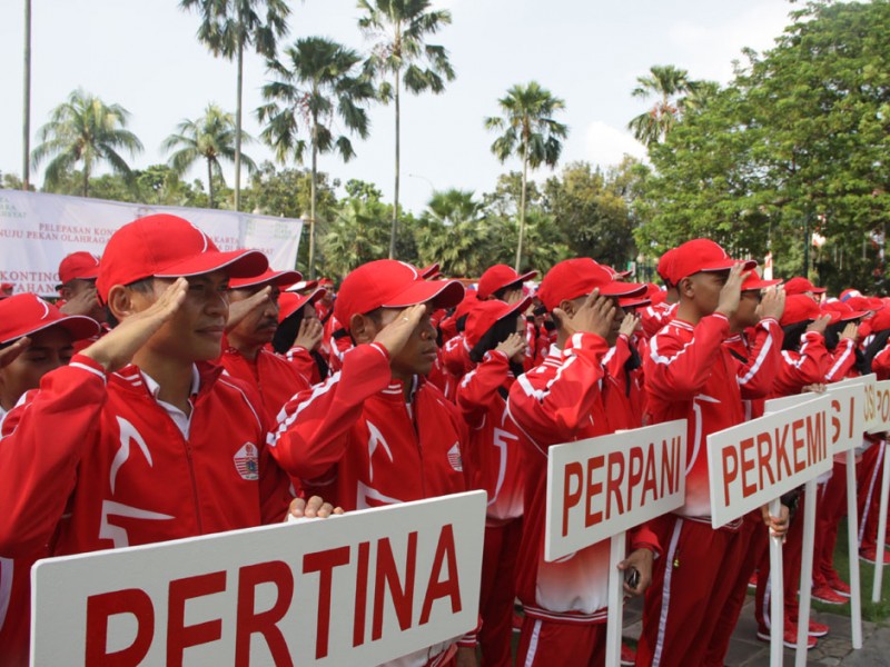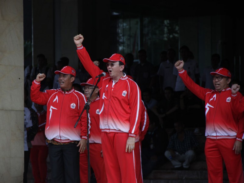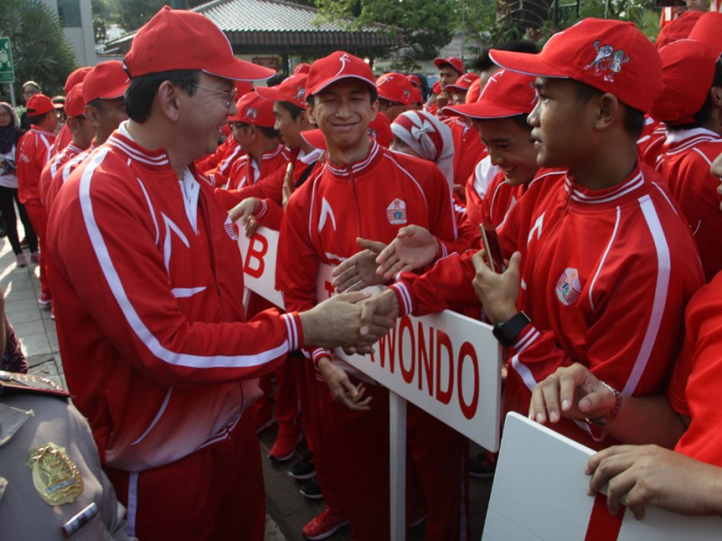 Gubernur DKI Jakarta, Basuki Tjahaja Purnama melepas 1.258 kontingen PON DKI Jakarta di halaman Balai Kota DKI Jakarta, Rabu (07/9). Kontingen ini yang akan berlaga di Pekan Olahraga Nasional (PON) XIX, di Jawa Barat pada 17 sampai 29 September mendatang.(Foto: Reza/Beritajakarta.com)