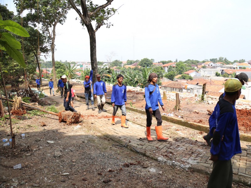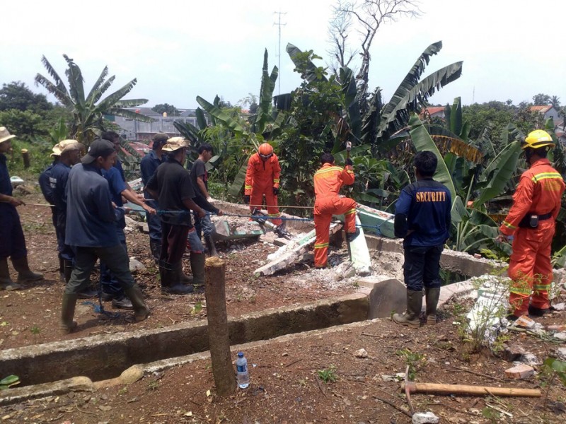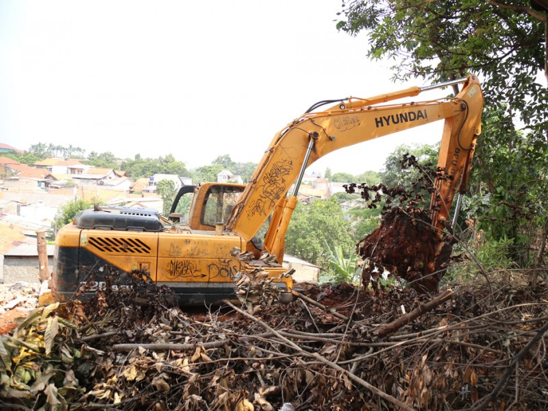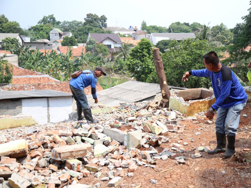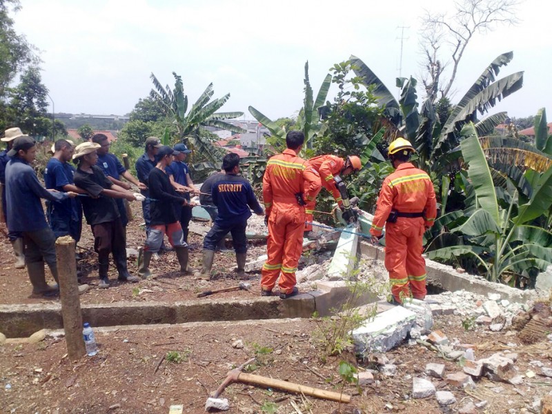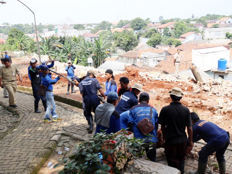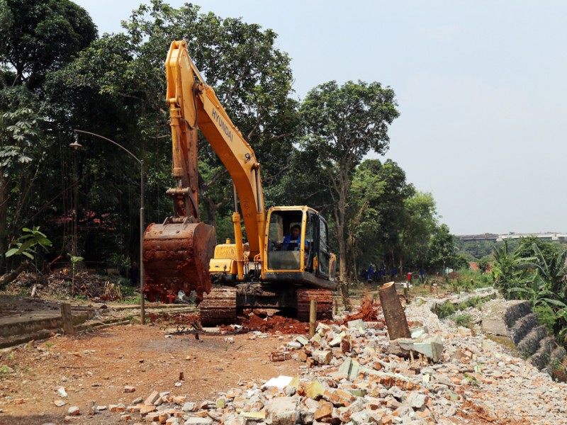 Tembok sepanjang 135 meter di lokasi longsor Hutan Kota Pondok Labu, Pondok Labu, Cilandak, Jakarta Selatan dibongkar oleh satuan tugas (satgas) Suku Dinas Kelautan Pertanian dan Ketahanan Pangan (KPKP), Suku Dinas Tata Air dan Tim Resc ue Suku Dinas Penanggulangan Kebakaran dan Penyelamatan (PKP) Jakarta Selatan, Selasa (13/9). Pembongkaran ini terkait proses penanganan longsor di sisi Timur hutan Kota Pondok Labu. Lonsornya sisi Timur Hutan Kota tersebut menyebakan pemukiman di Jalan Melati banjir. (Foto: Reza/Beritajakarta.com)