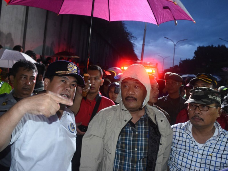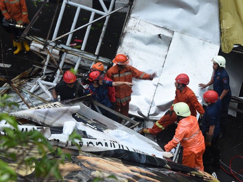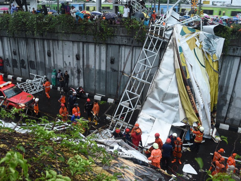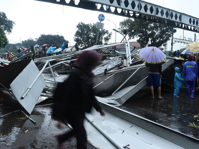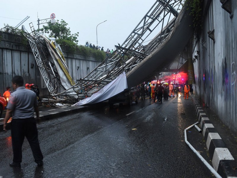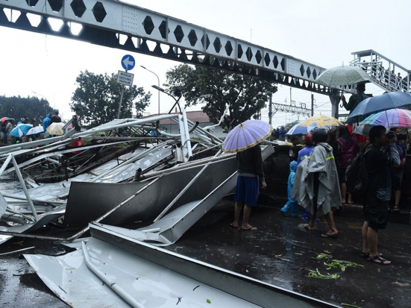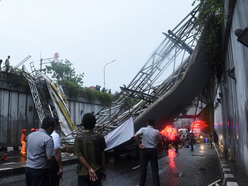 Pagar dan atap jembatan Penyebrangan Orang (JPO) Roboh di jalan Pasar Minggu Raya, Jakarta Selatan, Sabtu (24/9). Jembatan roboh akibat hujan yang disertain dengan angin kencang dan sejumlah ventilasi jpo tertutup papan reklame. (Foto: Reza/Beritajakarta.com)