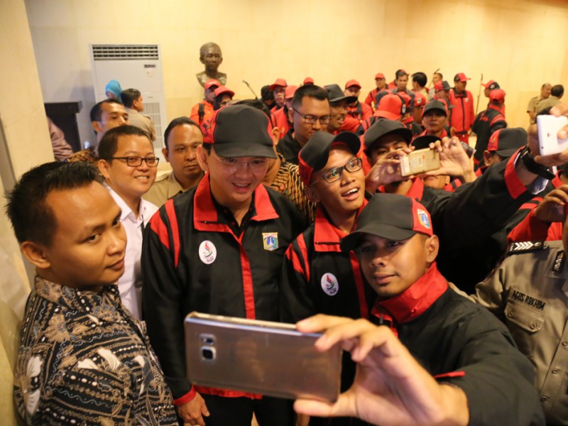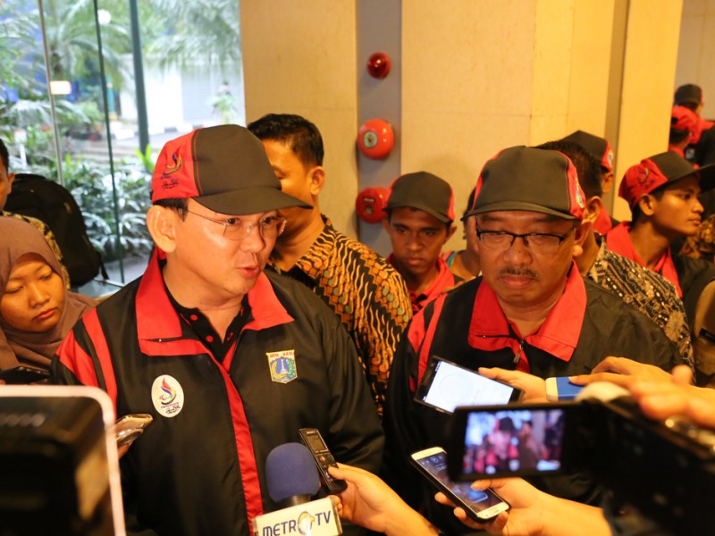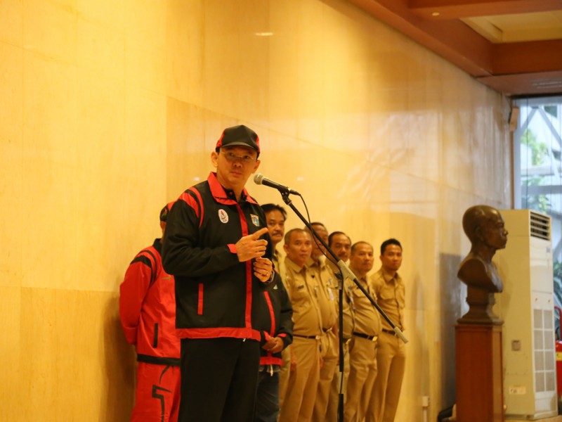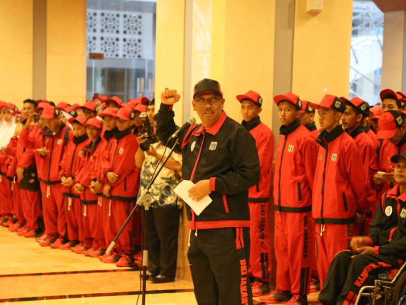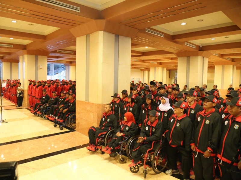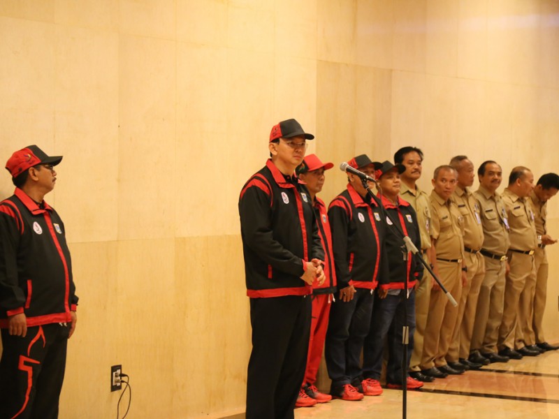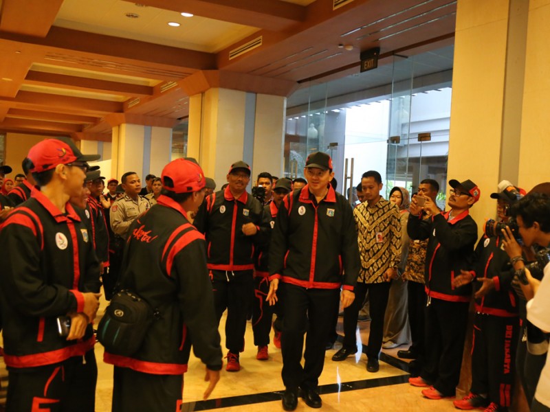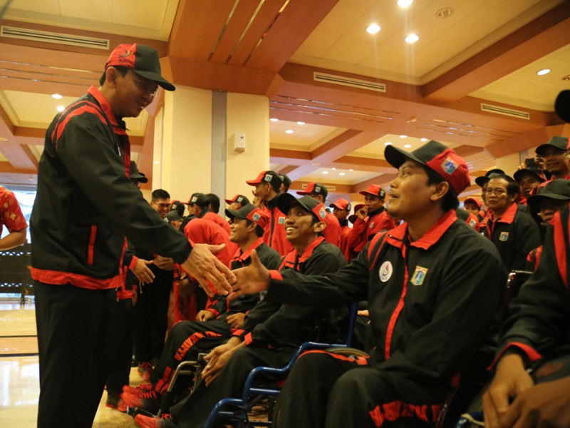 Gubernur DKI Jakarta, Basuki Tjahaja Purnama melepas dua kontingen atlet asal DKI Jakarta yakni kontingen Pekan Paralimpik Nasional (PAPERNAS) XV dan Pekan Olahraga dan Seni antar Pondok Pesantren Nasional (POSPENAS) VII tahun 2016 di Balai Kota DKI Jakarta, Selasa (04/10). (Foto: Reza/beritajakarta.com)