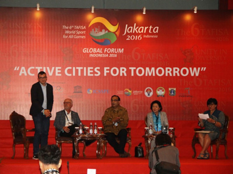 DKI Jakarta mewakili Indonesia menjadi tuan rumah The 6th TAFISA World Sport for All Games Global Forum. Sejumlah delegasi dari negara peserta maupun perwakilan dari UNESCO hadir di Jakarta International (JI) Expo, Kemayoran, Jakarta Pusat, Minggu (9/10/2016). Forum ini akan mendorong seluruh negara di dunia untuk mewujudkan active cities. (Foto: Yopie/beritajakarta.com)