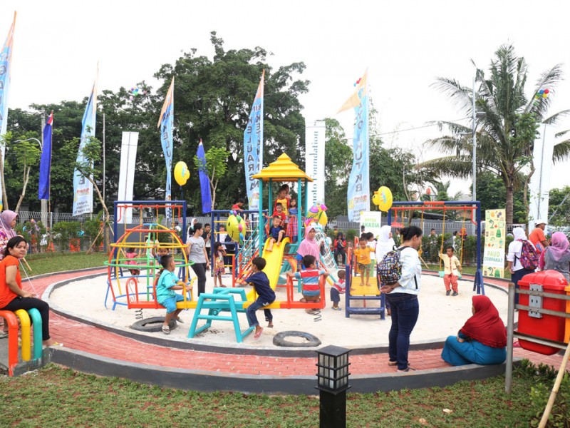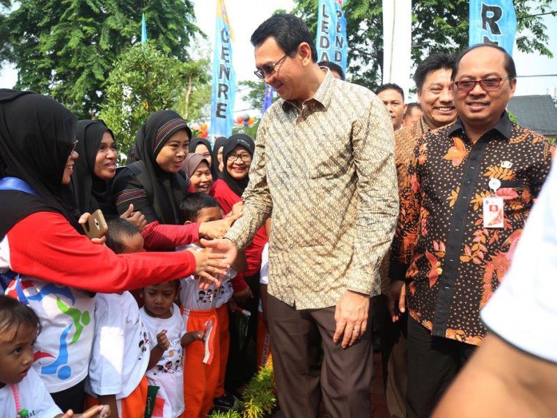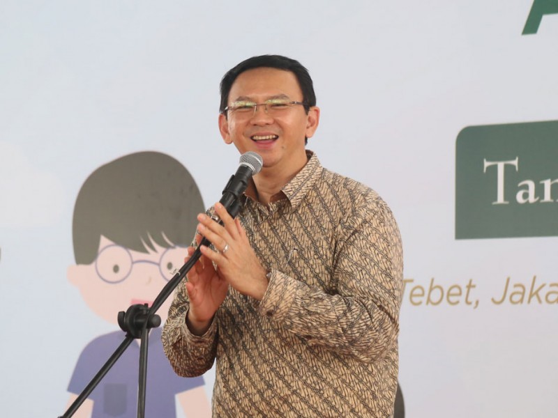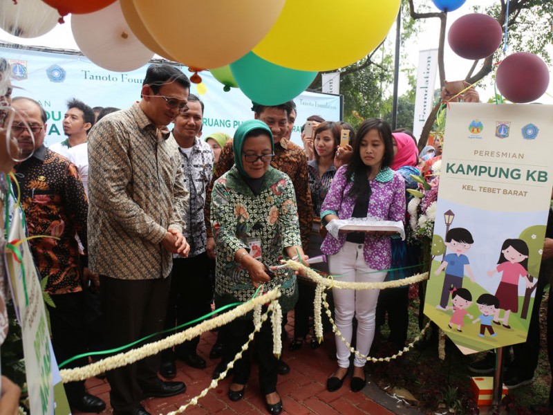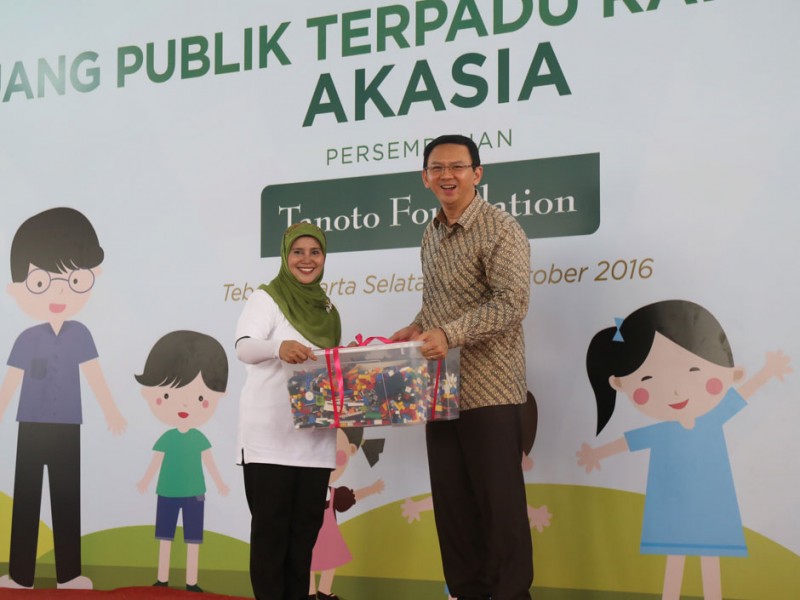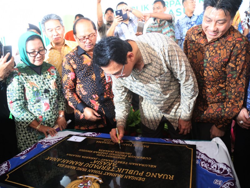 Gubernur DKI Jakarta Basuki Tjahaja Purnama meresmikann Ruang Publik Terpadu Ramah Anak (RPTRA) Akasia, Jalan Tebet Barat, Tebet, Jakarta Selatan, Jumat (21/10). RPTRA ini dibangun melalui program Corporate Social Responsibility (CSR) dari Tanoto Fondation. Peresmian RPTRA ini ditandai oleh penandatanganan prasasti oleh Basuki yang dilanjutkan dengan peninjauan fasilitas RPTRA.