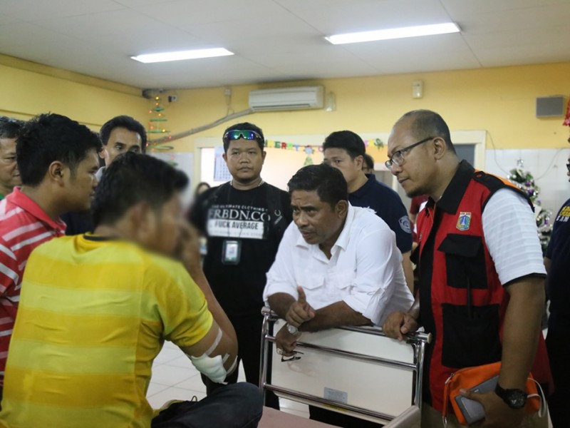 Sebanyak 23 orang meninggal dan puluhan lainnya terluka dalam peristiwa terbakarnya KM Zahro Ekspress sesaat setelah bertolak dari Dermaga Muara Angke menuju Pulau Tidung, Minggu (1/1/2017) pagi. Pelaksana Tugas (Plt) Gubernur DKI Jakarta pun menjenguk korban di RS Atamajaya, Pluit, Jakarta Utara, untuk menyampaikan empatinya atas musibah ini. (Foto: Yopie/beritajakarta.com)