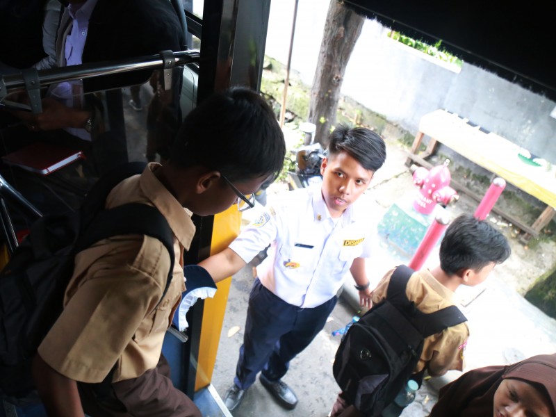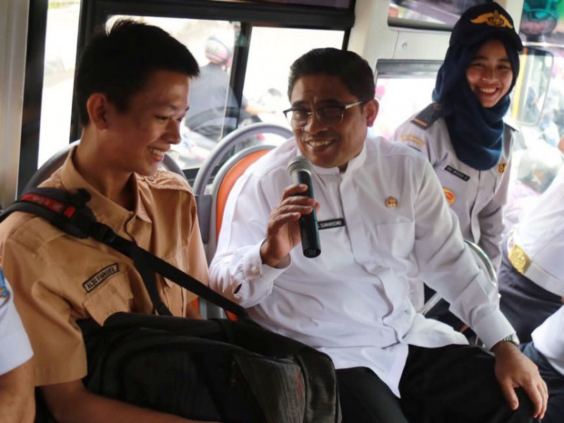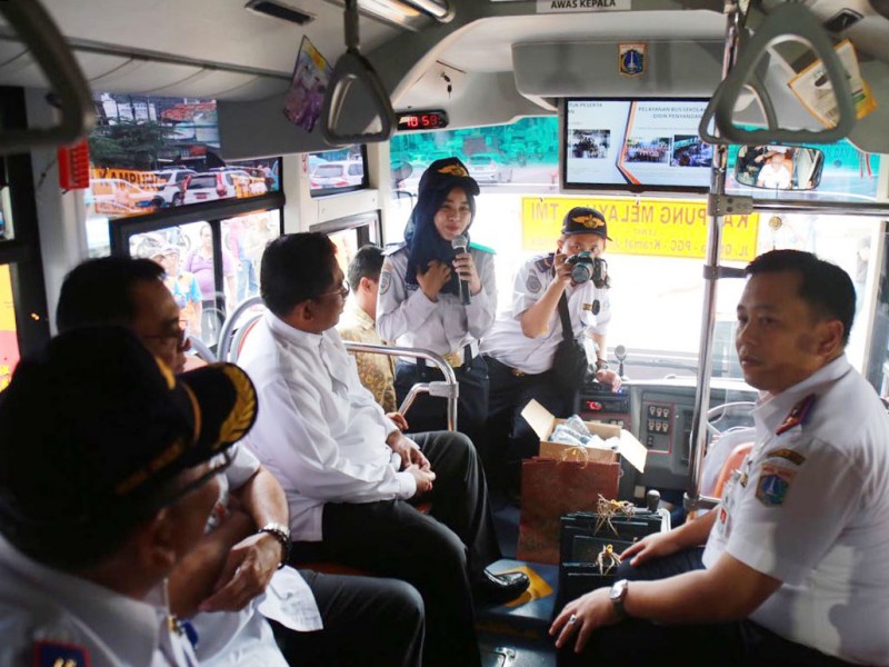 Pelaksana Tugas (Plt) Gubernur DKI Jakarta, Sumarsono melakukan peninjauan langsung bus sekolah dengan rute Kampung Melayu-Taman Mini Indonesia Indah (TMII), Jakarta Timur, Rabu (11/1). Selain untuk melihat kondisi bus, Sumarsono juga ingin mengetahui aspirasi para pelajar pengguna bus sekolah. Sumarsono menyempatkan berdialog dengan beberapa siswa dengan melontarkan berbagai pertanyaan, seperti kondisi bus, layanan, serta tarif yang dikenakan. (Foto: Reza/beritajakarta.com)