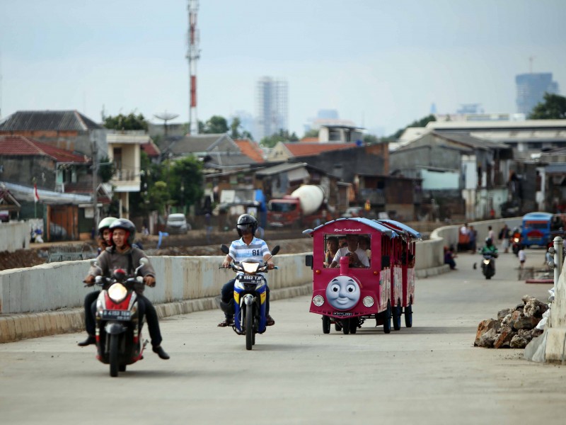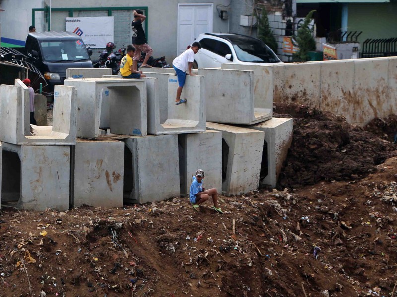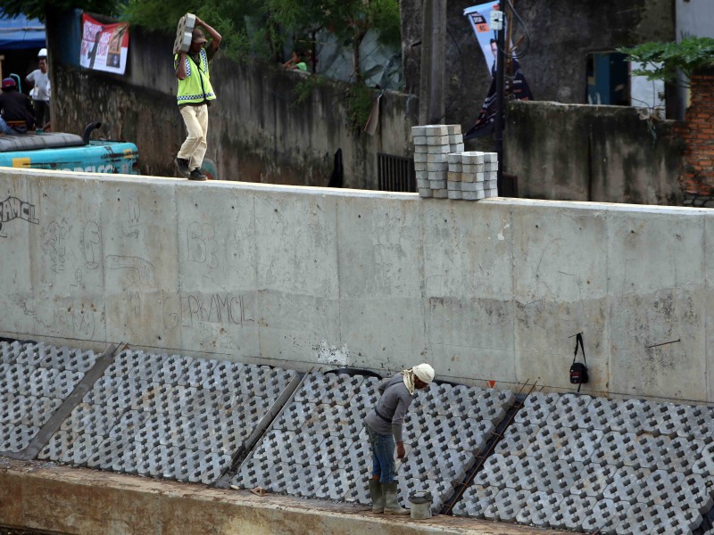 Pemerintah Provinsi DKI Jakarta terus melakukan pembenahan di lokasi normalisasi Sungai Ciliwung, Bukit Duri, Jakarta Selatan, Rabu (11/1). Setelah di turap, proses selanjutnya pada sungai ciliwung yaitu pemasangan konblok disepanjang dinding sungai agar tidak terjadi pergeseran dan sebagai resapan air. (Foto: Punto/beritajakarta.com)