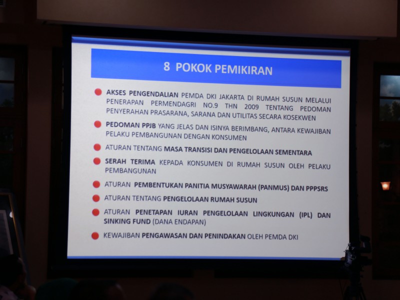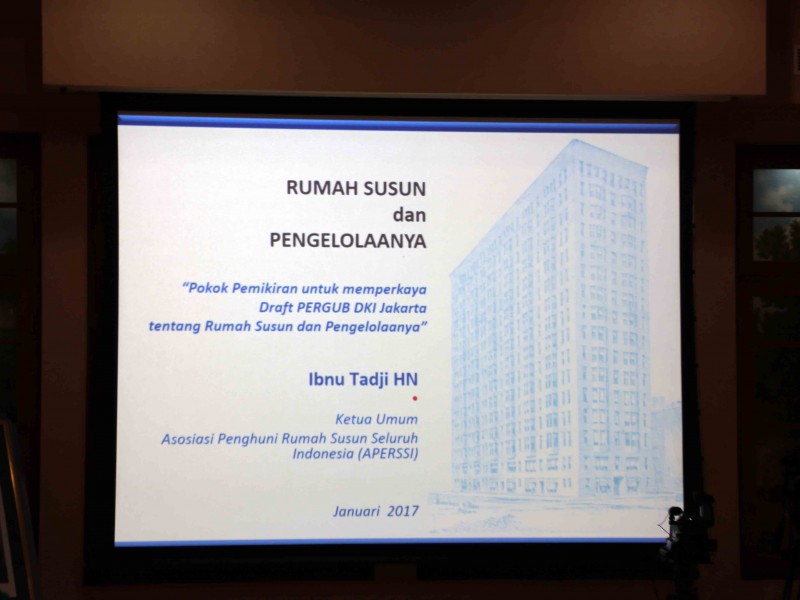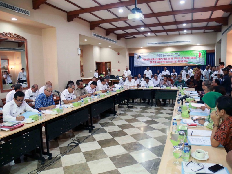 Pemerintah Provinsi (Pemprov) DKI Jakarta menggelar Focus Group Discussion (FGD) terbatas, tentang Pengelolaan Rumah Susun Sederhana Milik (rusunami), di Ruang Tempo Doloe, Balai Kota DKI Jakarta, Rabu (25/1). Diskusi yang dibuka oleh Pelaksana Tugas (Plt) Gubernur DKI Jakarta, Sumarsono ini diadakan dalam rangka penyusunan peraturan gubernur (pergub), yang salah satunya mengatur mengenai pembentukan Perhimpunan Pemilik dan Penghuni Satuan Rumah Susun (P3SRS). (Foto: Reza/beritajakarta.com)