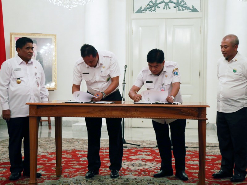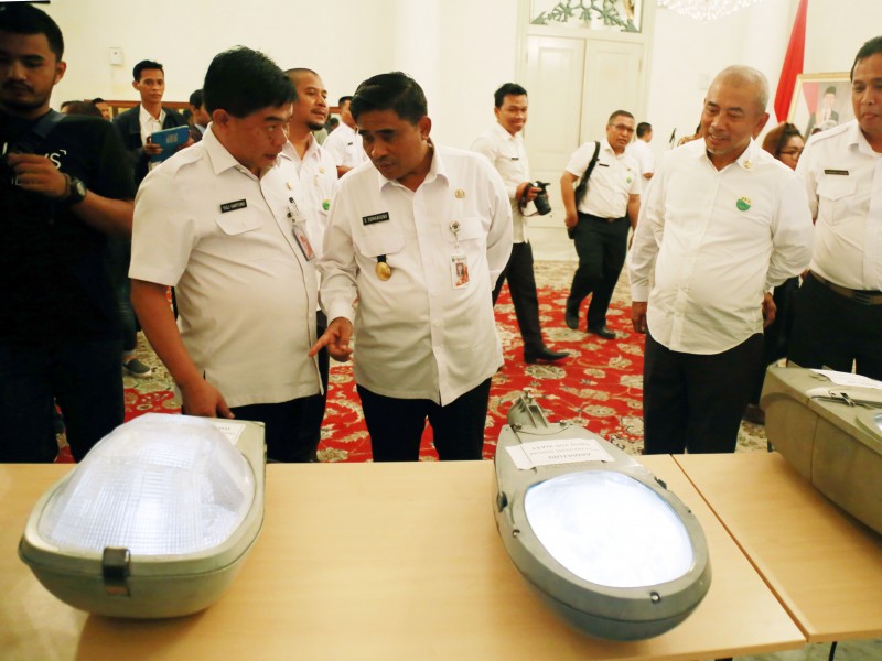 Pemerintah Provinsi (Pemprov) DKI Jakarta memberikan hibah sebanyak 20 lampu armatur lampu layak pakai kepada Pemerintah Kota Bekasi di Balai Kota DKI Jakarta, Rabu (25/1). DKI telah mengganti sebanyak 89.417 buah lampu berjenis high pressure sodium (HPS) dengan LED. Bekasi merupakan daerah pertama yang menyambut penawaran hibah lampu tersebut. (Foto: Reza/beritajakarta.com)