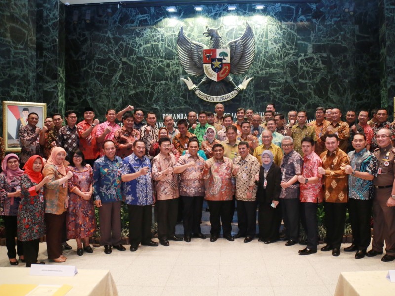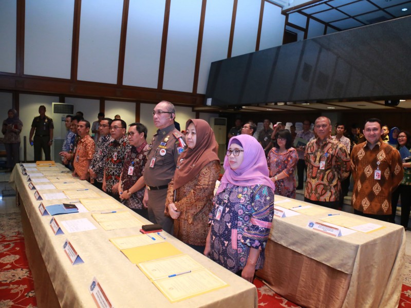 Kepala Satuan Kerja Perangkat Daerah (SKPD) di Pemerintah Provinsi (Pemprov) DKI Jakarta menandatangani perjanjian kinerja menggunakan sistem Key Performance Indicator (KPI) dan komitmen Open Data di Balai Kota Jakarta, Jumat (27/1). Dengan sistem KPI, kinerja pejabat di setiap SKPD dapat terukur dan terlihat berhasil atau tidaknya. (Foto: Reza/beritajakarta.com)