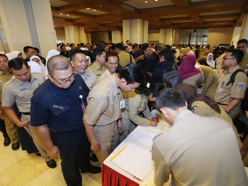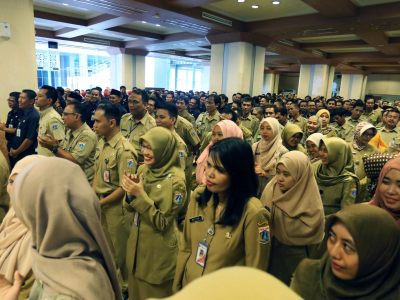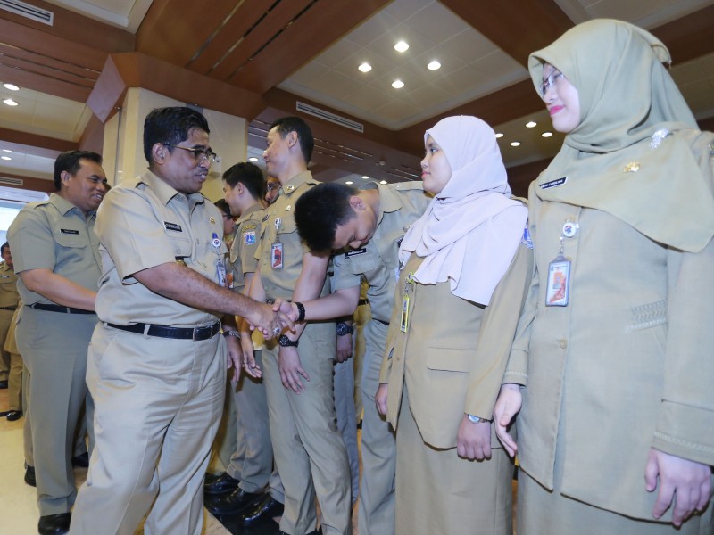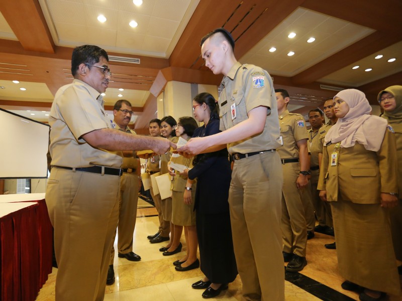 Sebanyak 211 guru bantu di Provinsi DKI Jakarta menerima surat keputusan (SK) pengangkatan Calon Pegawai Negeri Sipil (CPNS) dari Pemerintah Provinsi (Pemprov) DKI Jakarta, di Balai Kota DKI, Senin (30/1). Pemberian SK pengangkatan CPNS tersebut diberikan kepada guru bantu tahun 2016 dengan rincian kepada 86 guru SD, 65 guru SMP, 42 SMA, 17 guru SMK dan 1 guru SLB. (Foto: Punto/beritajakarta.com)