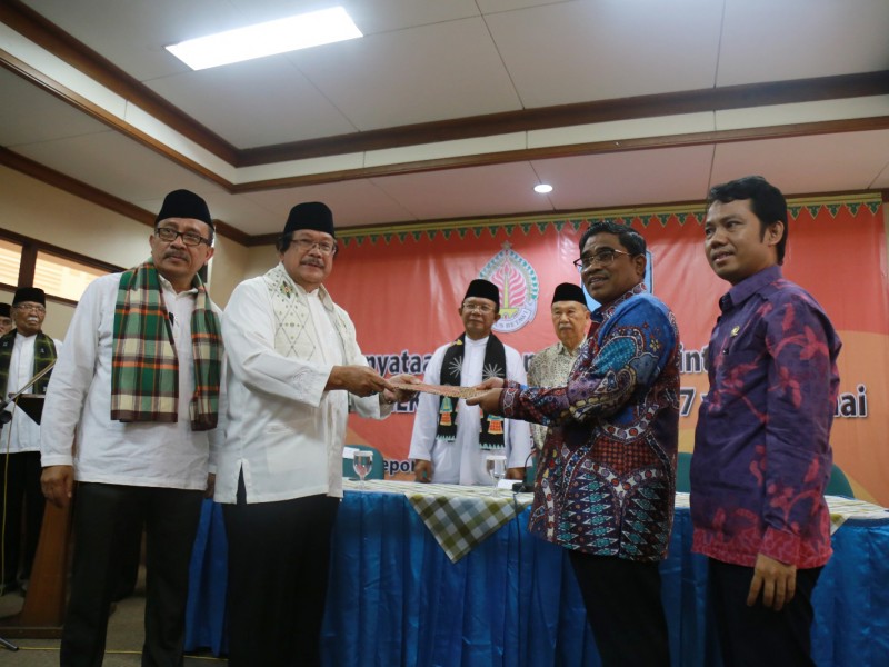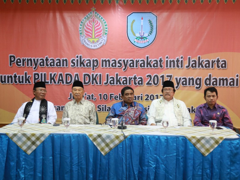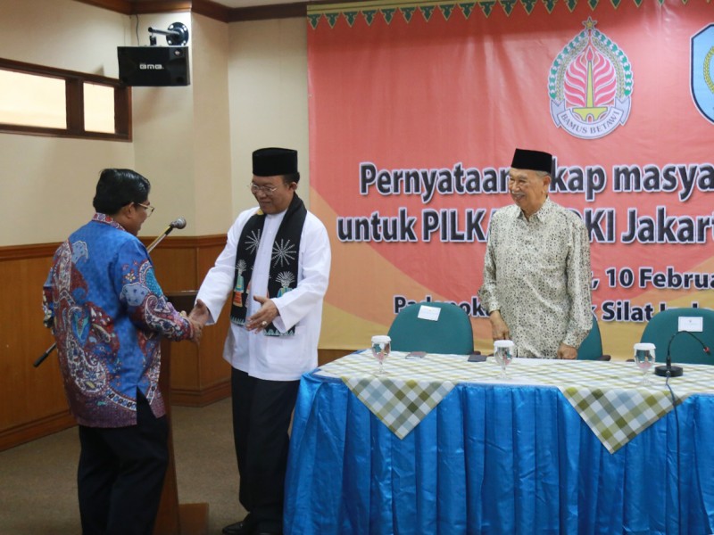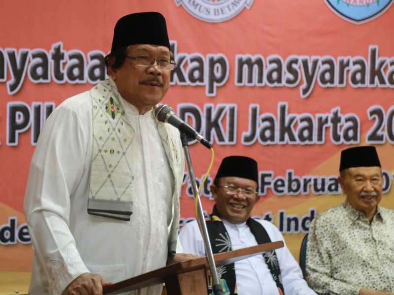 Pelaksana Tugas (Plt) Gubernur DKI Jakarta, Sumarsono menghadiri deklarasi Pilkada damai oleh masyarakat inti Jakarta yang tergabung dalam Ikatan Warga Djakarta (Iwarda), di Padepokan Pencak Silat, TMII, Jakarta Timur, Jumat (10/2). Sumarsono menegaskan, dirinya sangat mendukung adanya deklarasi ini.(Foto: Reza/beritajakarta.com)
