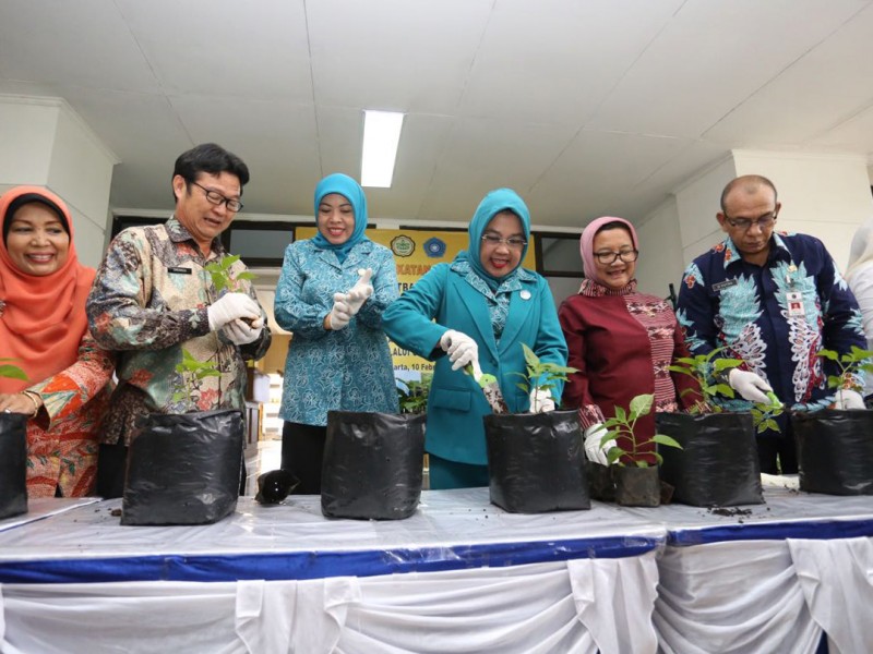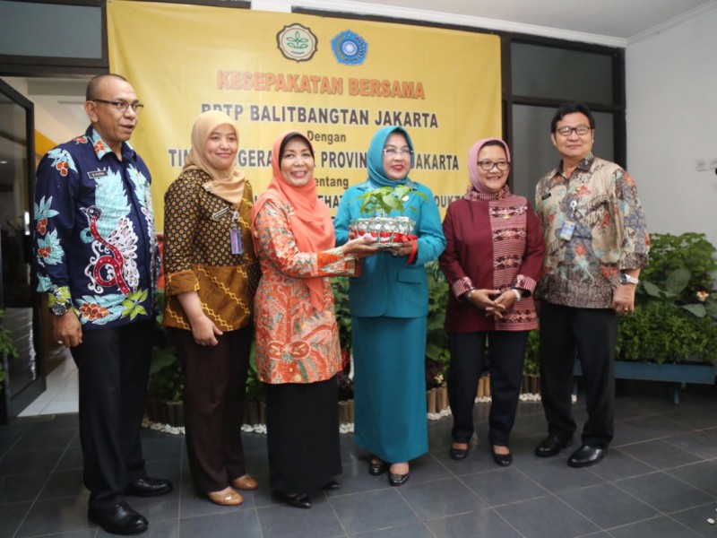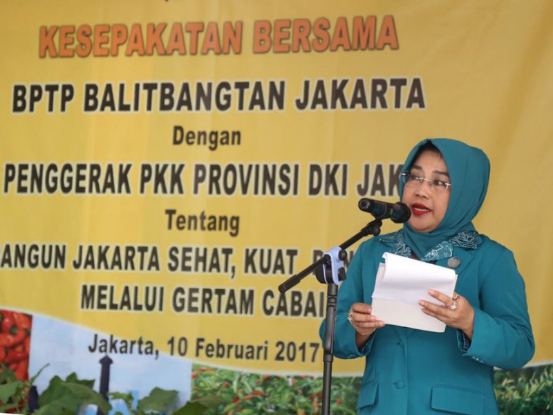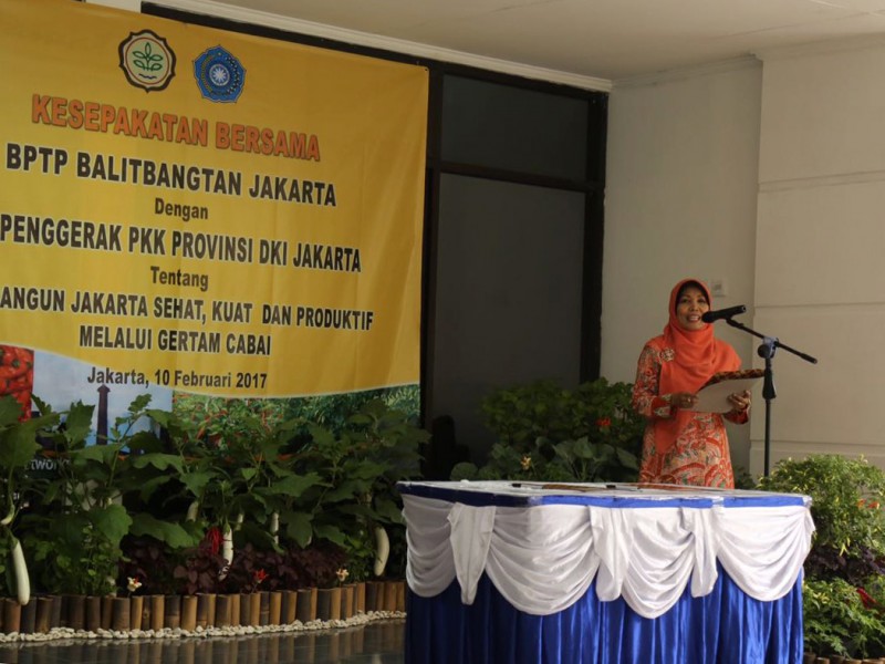 Pelaksana Tugas (Plt) Ketua TP PKK DKI Jakarta, Tri Rachayu Sumarsono menandatangani perjanjian nota kesepahaman dengan Balai Pengkajian Teknologi Pertanian (BPTP) DKI Jakarta di Kantor BPTP Jakarta, Jalan Raya Ragunan NO. 30, Pasar Minggu, Jakarta Selatan, Jumat (10/2). Perjanjian nota kesepahaman ini terkait bantuan 25 ribu bibit cabai yang nantinya akan didistribusikan kepada masyarakat Ibukota. (Foto: Punto/beritajakarta.com)