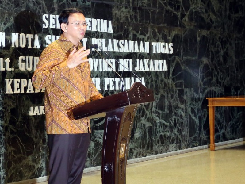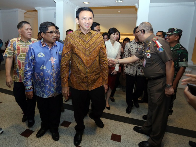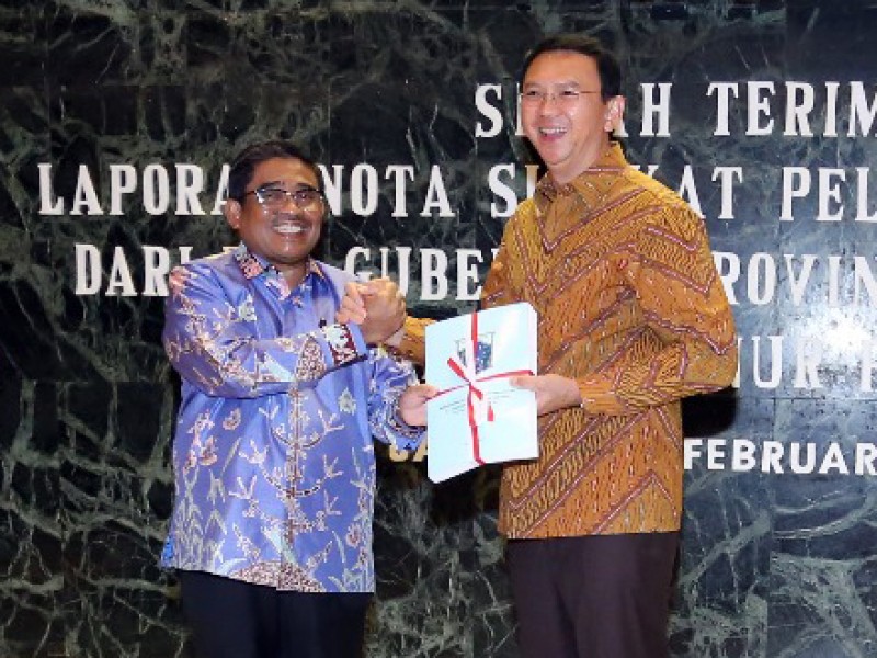Pelaksana Tugas (Plt) Gubernur DKI Jakarta, Sumarsono menyerahkan nota singkat kerja kepada Gubernur Petahana DKI Jakarta, Basuki Tjahaja Purnama di Balai Kota Jakarta, Sabtu (11/2). Penyerahan dilakukan bertepatan dengan hari terakhir Sumarsono memimpin Ibukota. Dalam nota kerja singkat yang diserahkan berisi mengenai laporan tugas apa saja yang telah dilaksanakan selama menjabat sebagai Plt Gubernur DKI. (Foto: Punto/beritajakarta.com)